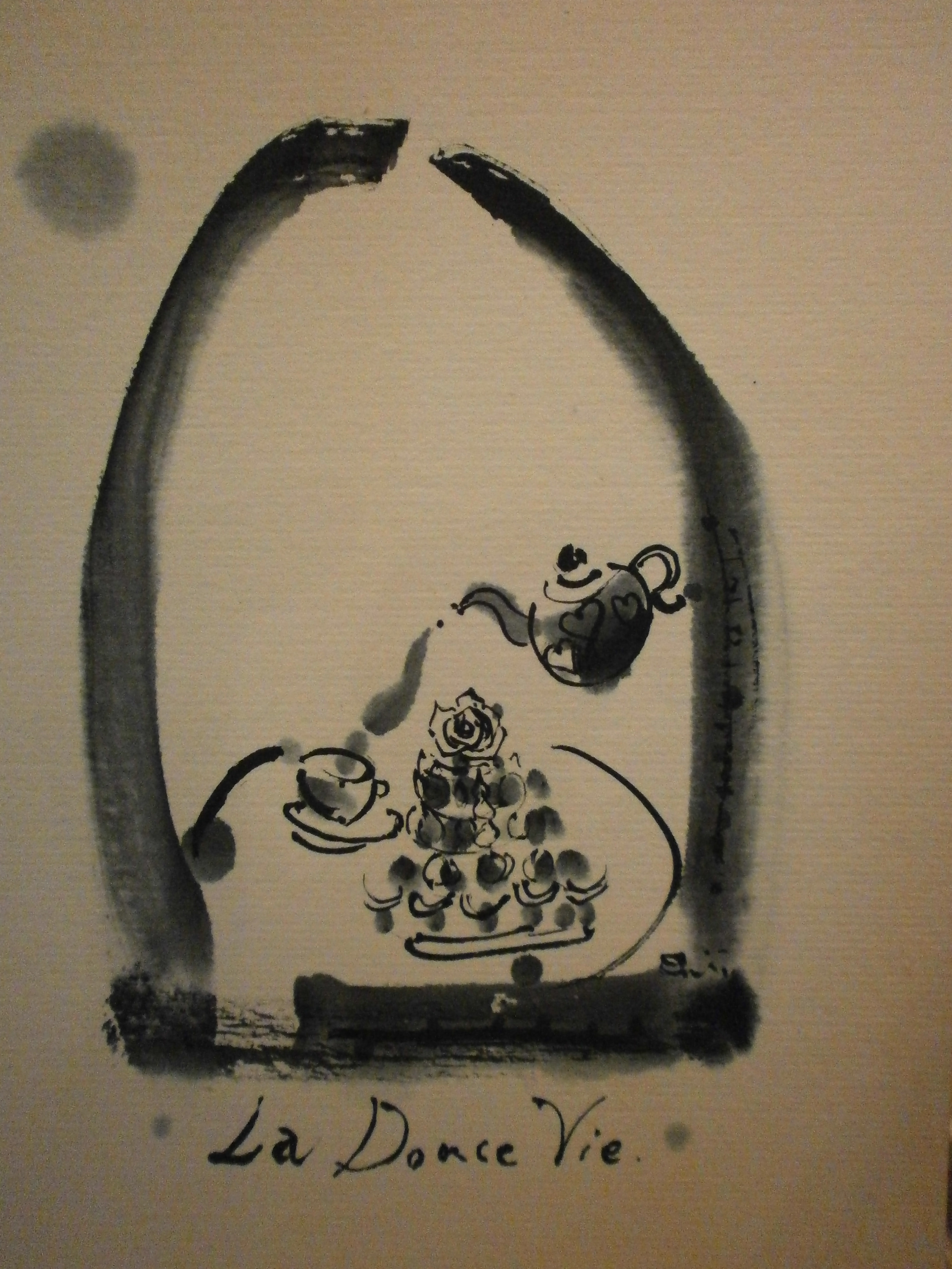 今年は ・・・ ケーキと紅茶のティータイムを描いてみました。