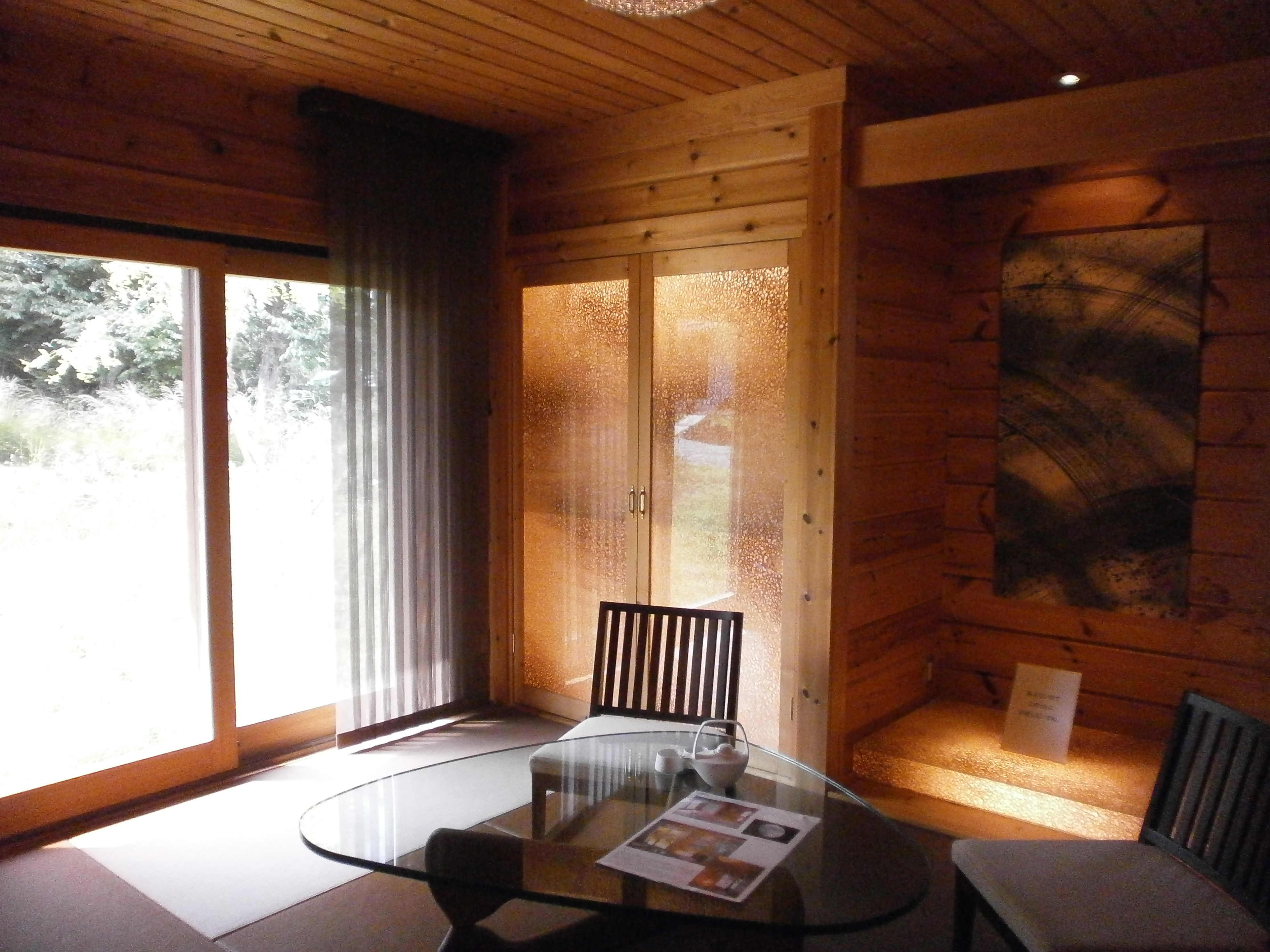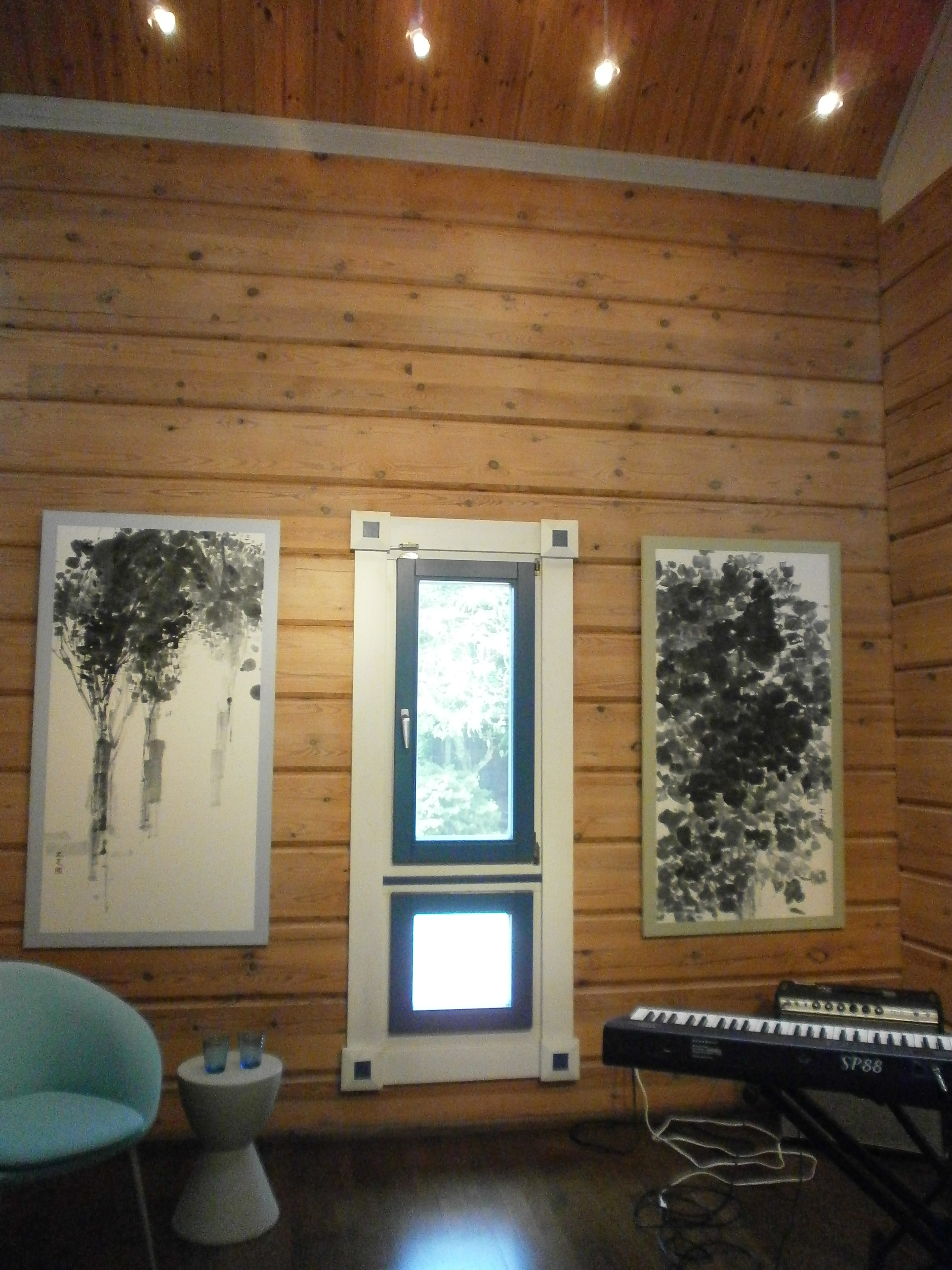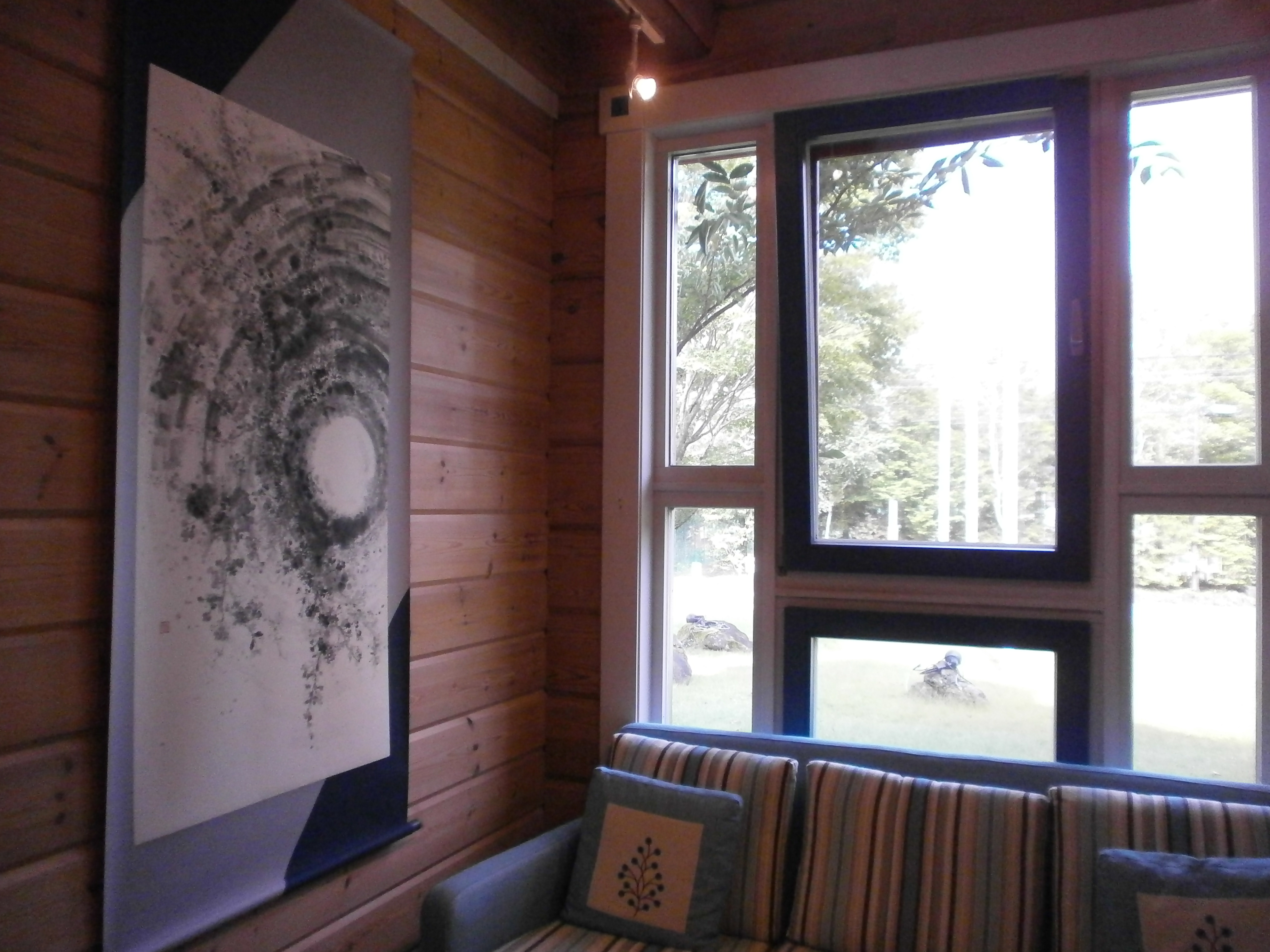 富士山のふもと 山中湖にあるログハウス ビ・ボーンさんでひらかれる墨画展、