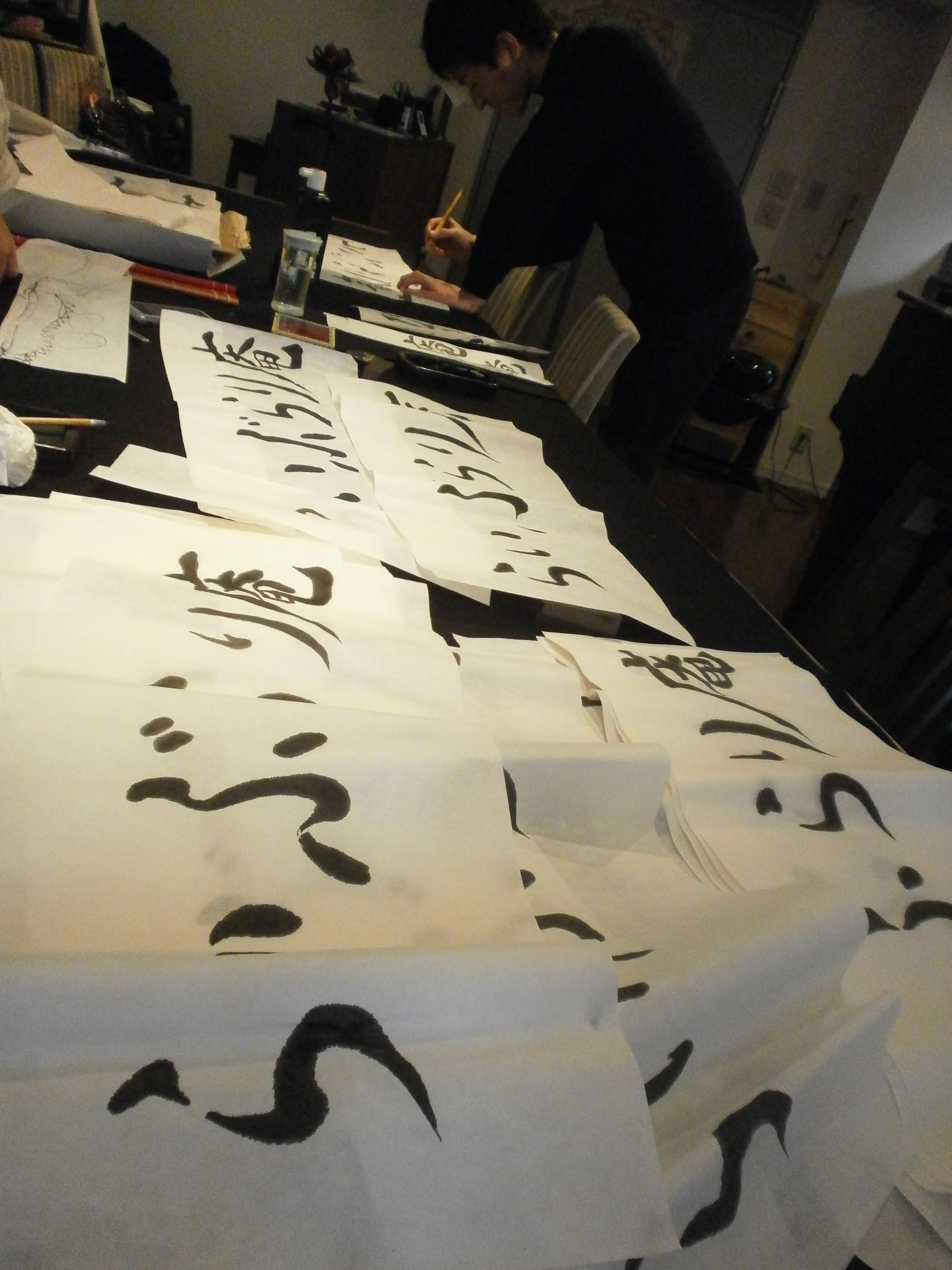 ほとんどの方が はじめての挑戦で 墨の磨り方や、筆使いなど