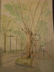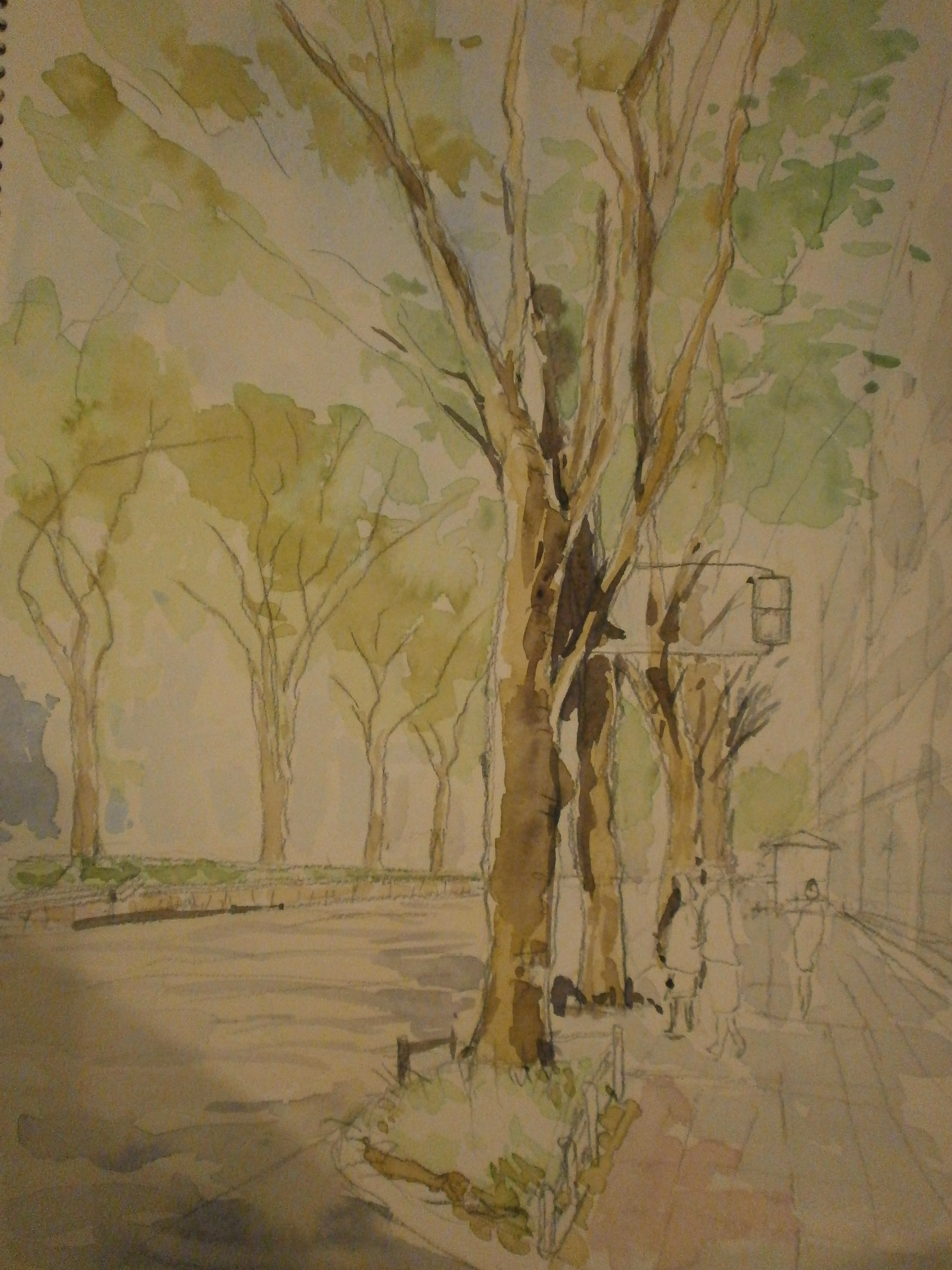 風がふいて日差しが木の葉の間から煌めく 青葉通りの風景を描きました。