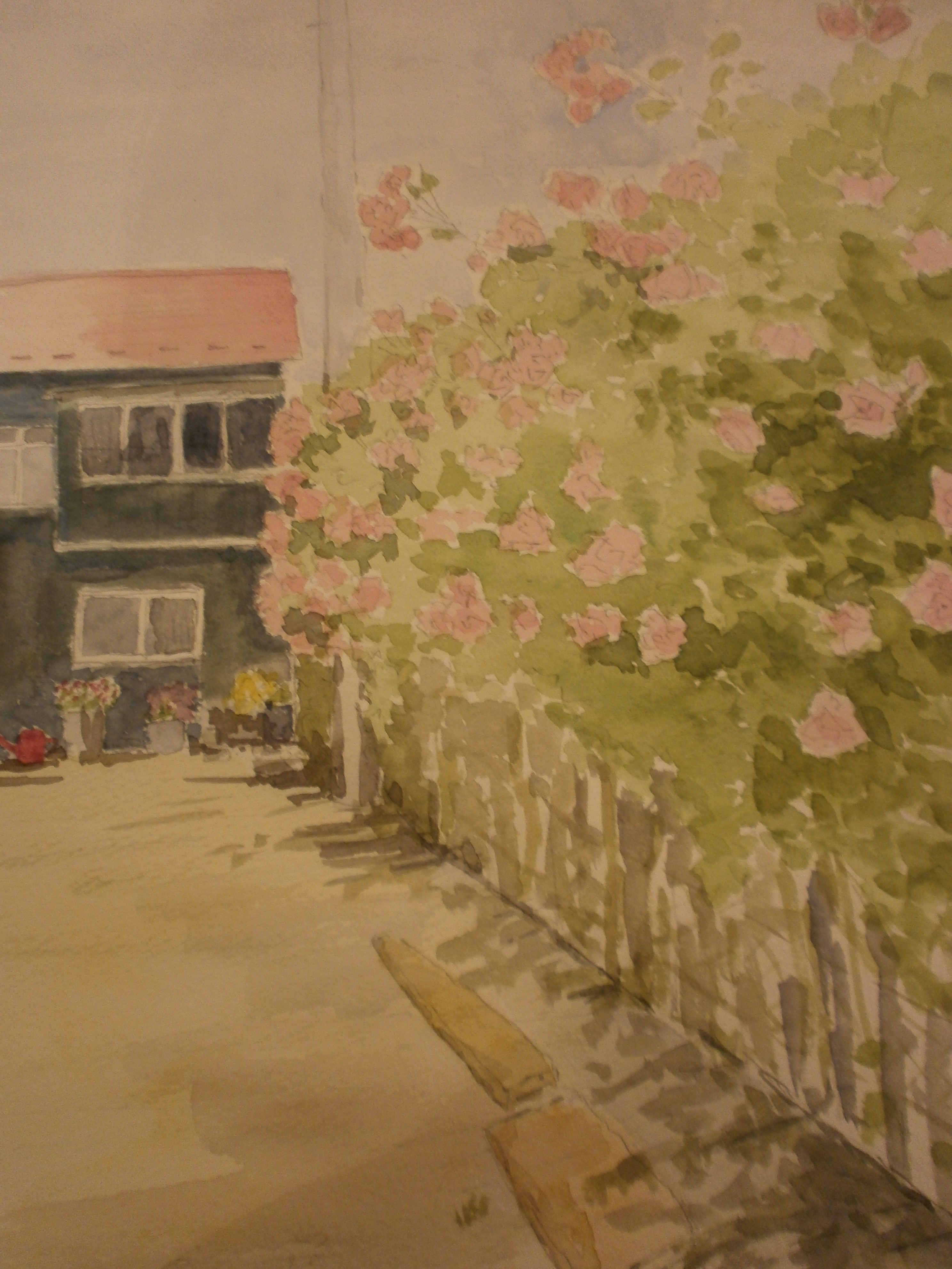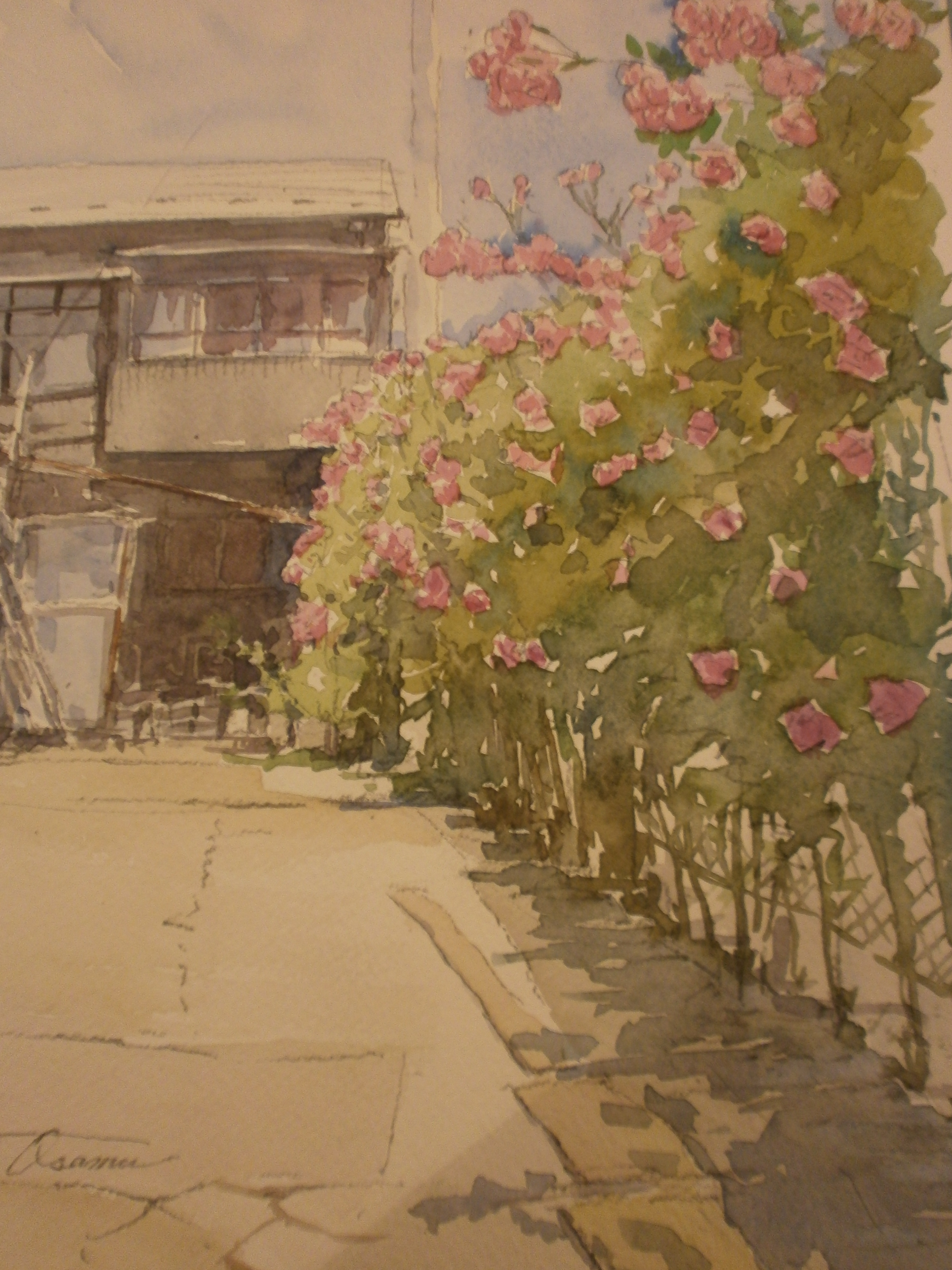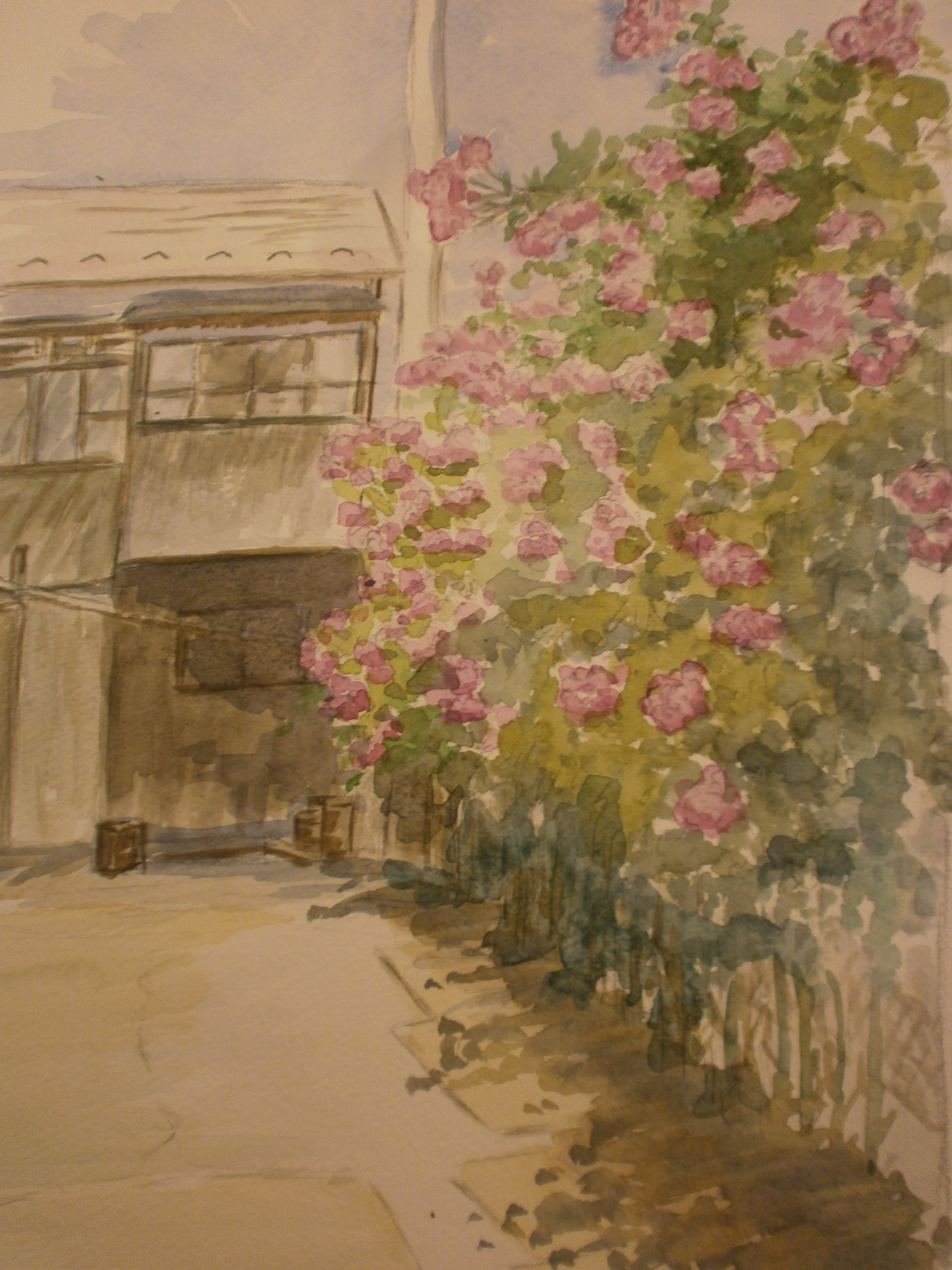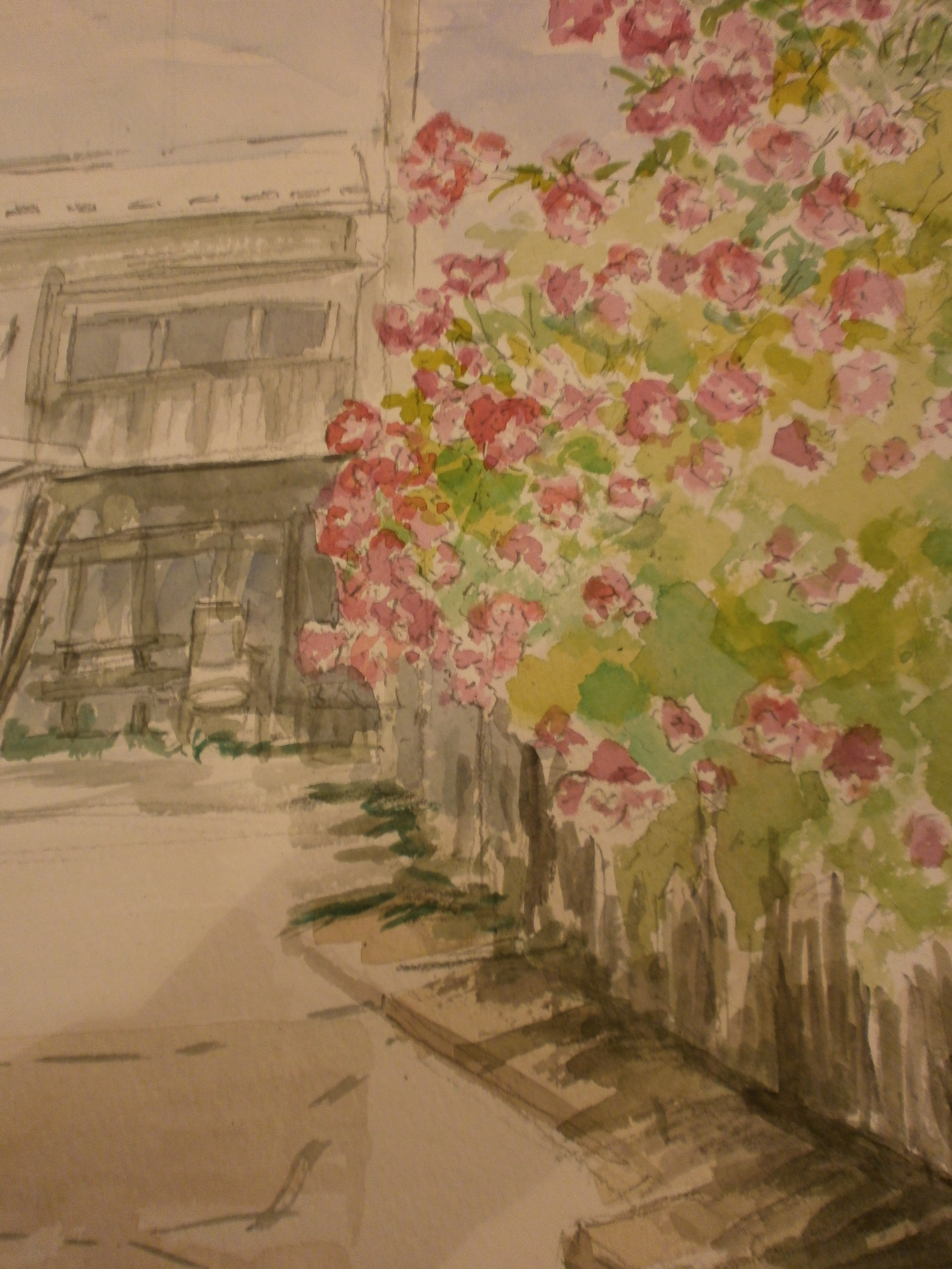 今日の水彩画教室は そんな慌ただしさを忘れて 気持ちも華やぐようなピンク色の薔薇の街かどを描きました。