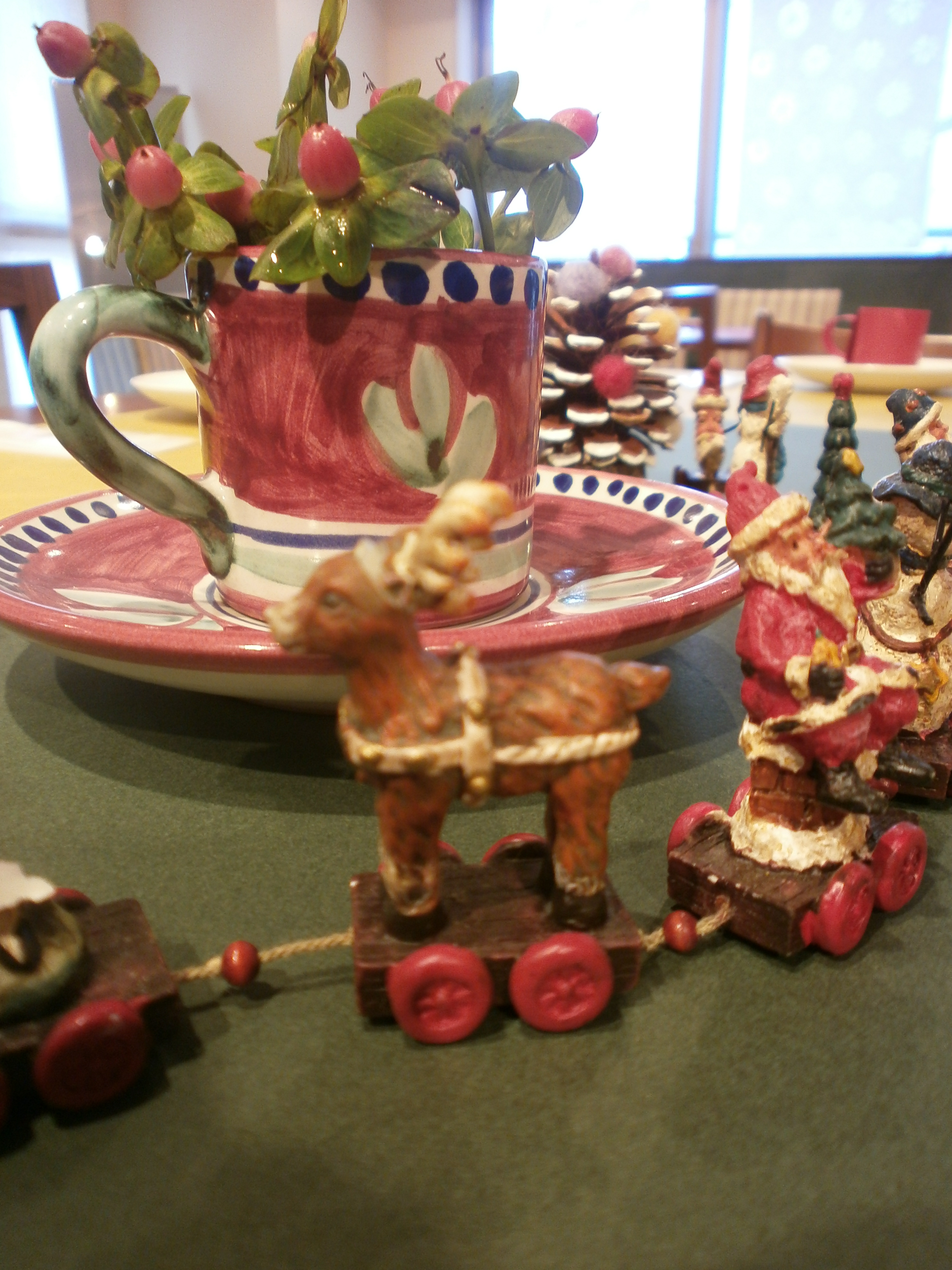 オカイモノの合間、クリスマスコーディネートのテーブルであたたかいお飲み物や絵本をお楽しみ下さい。