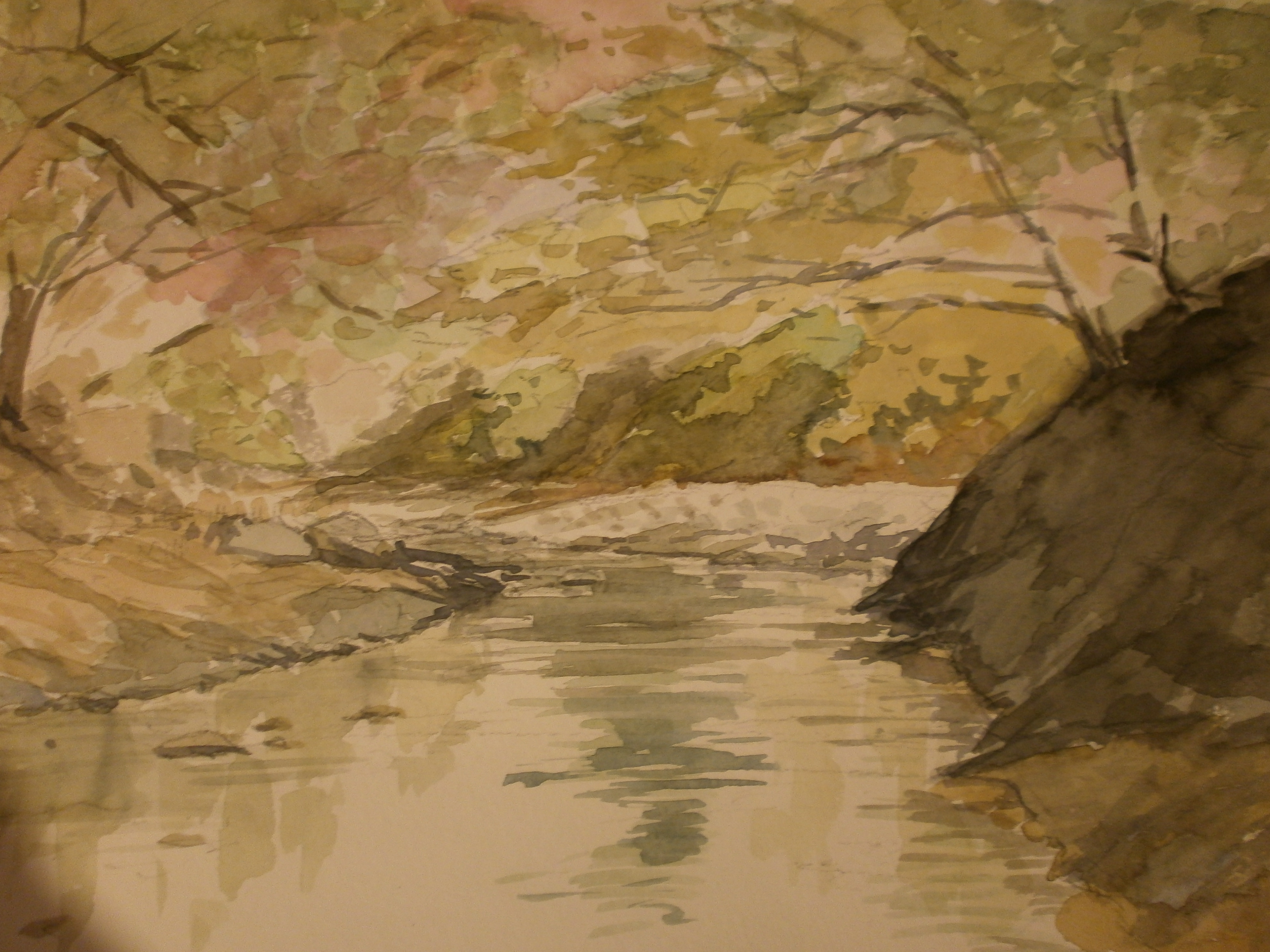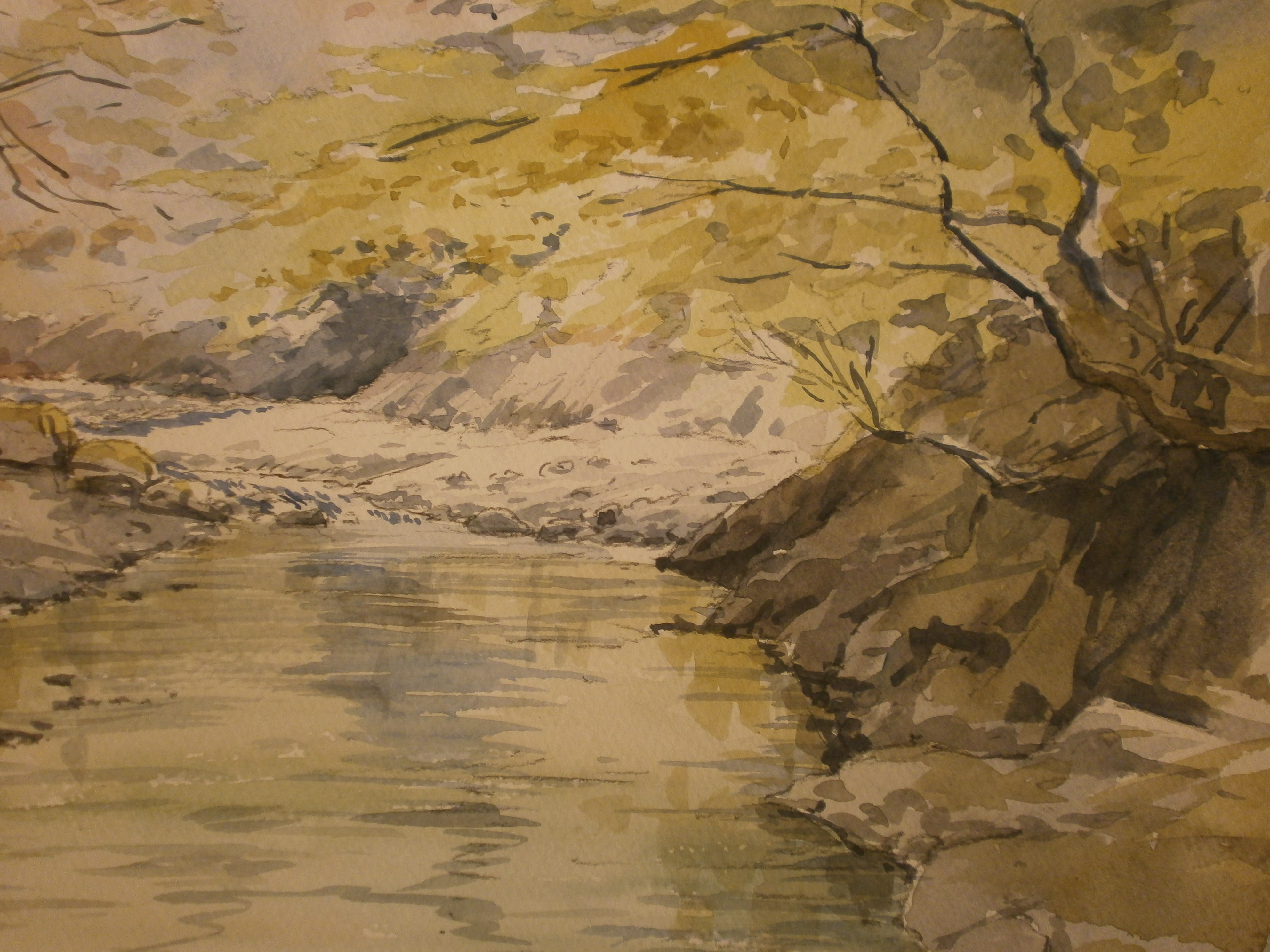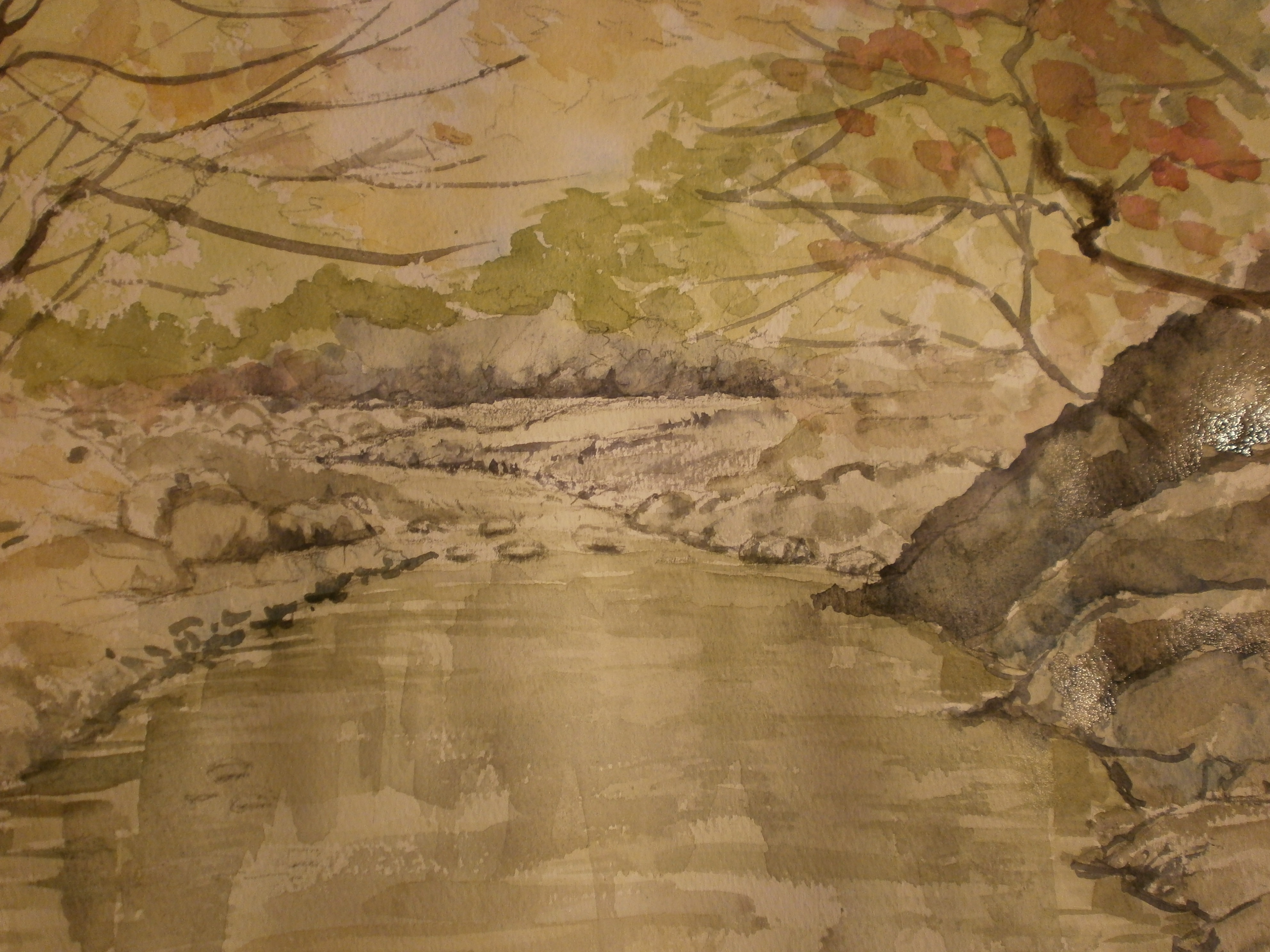 今月は、秋らしく木々が色つきはじめた 新川のあたりを描きました。