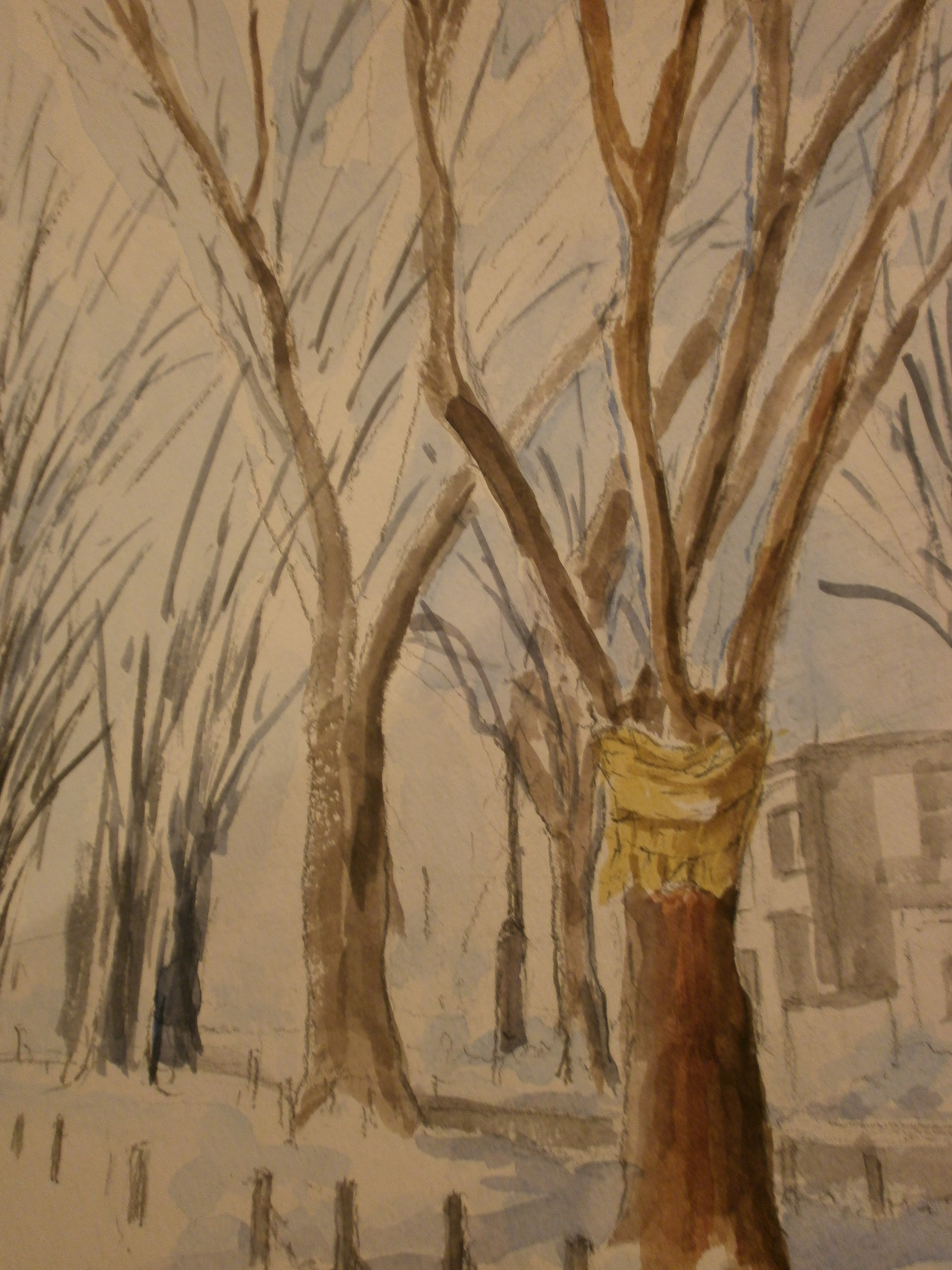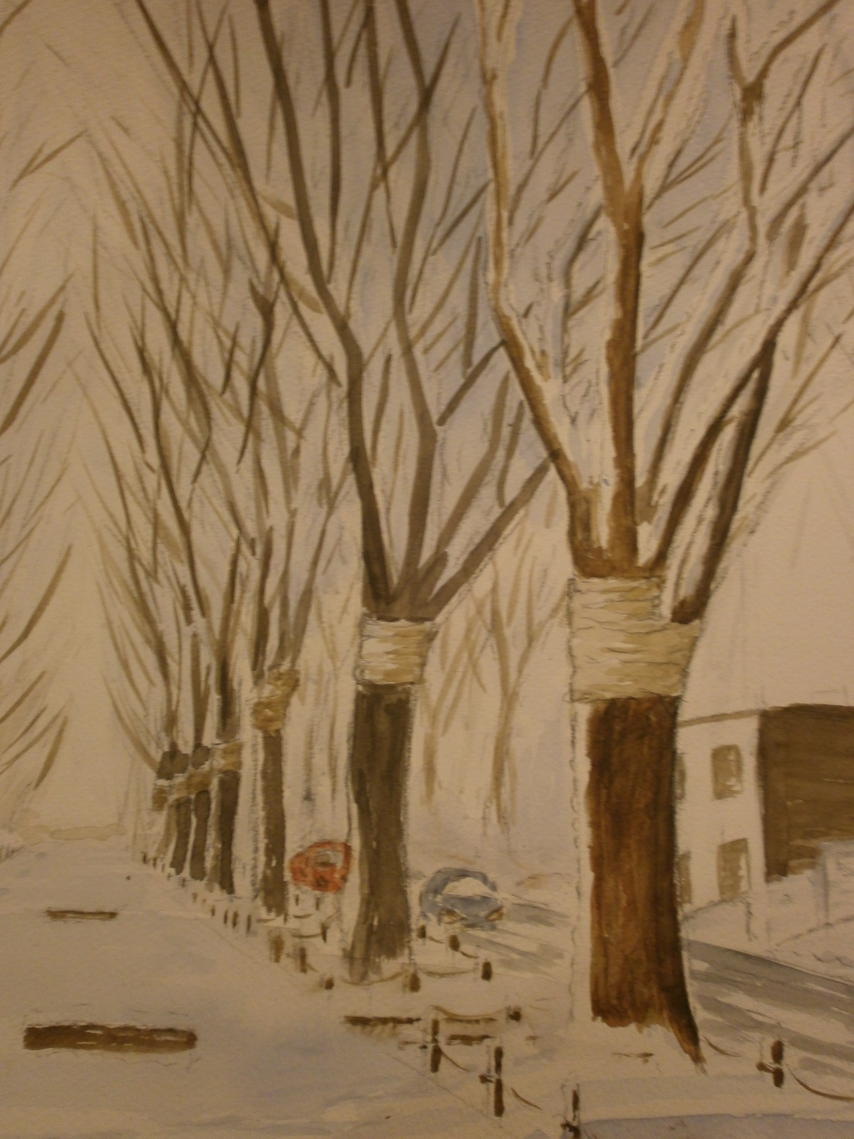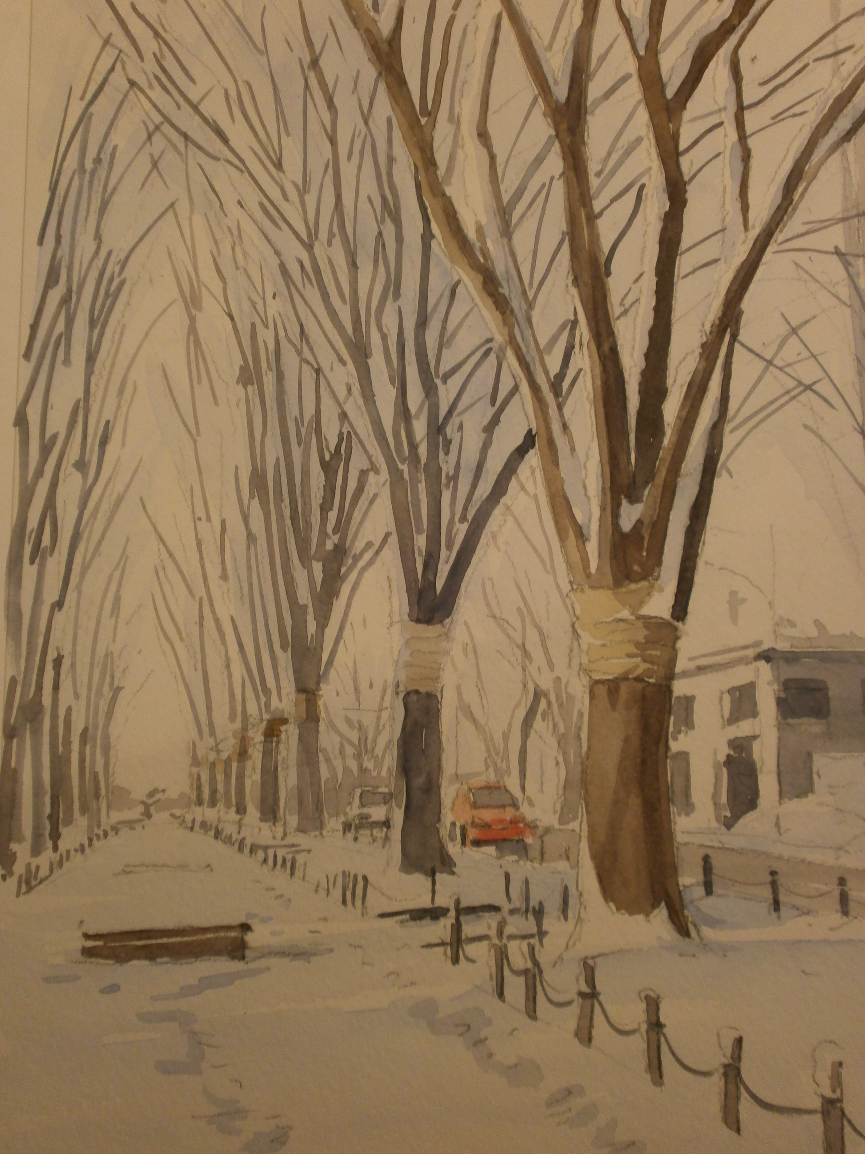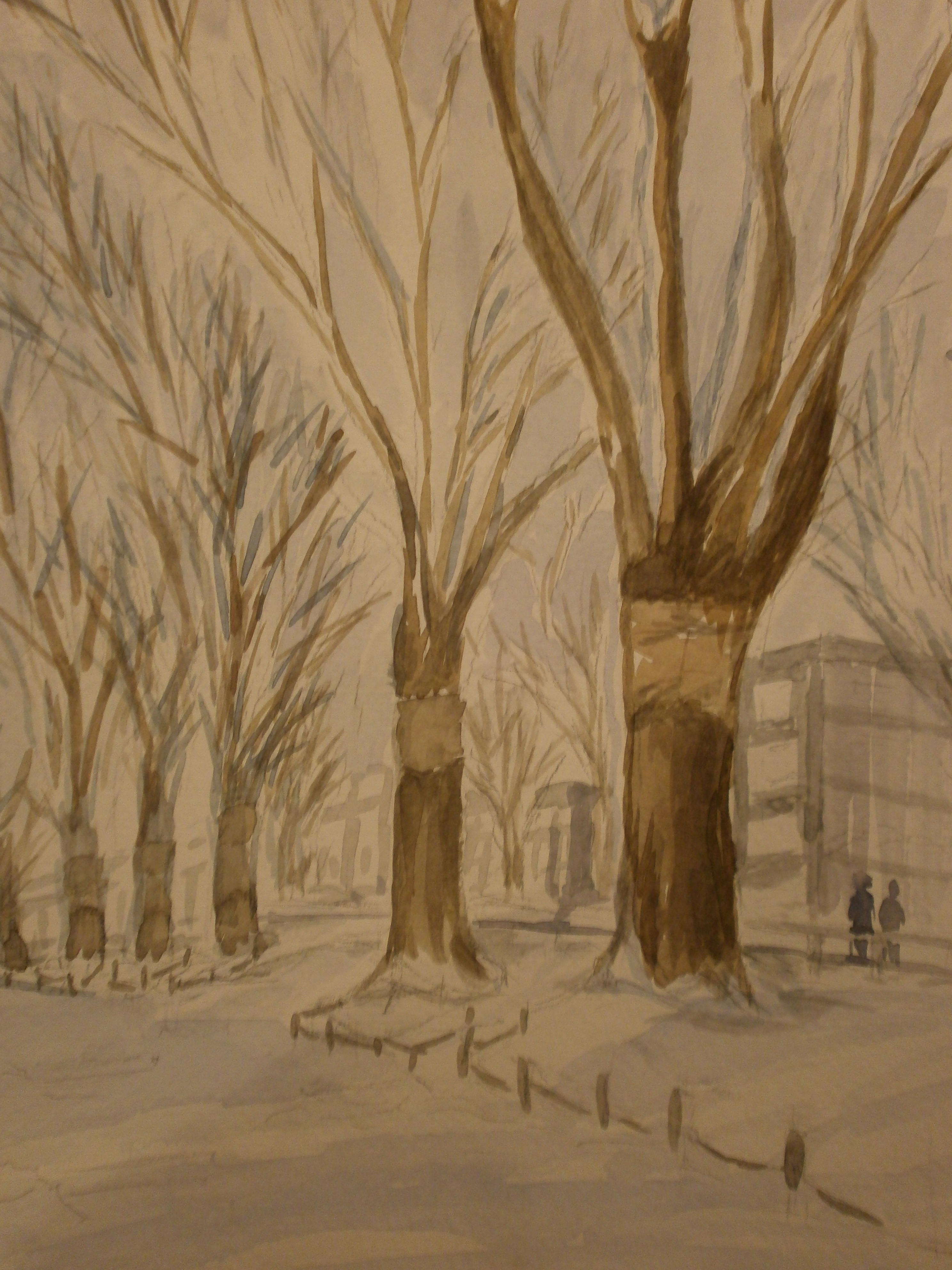 水彩画教室では 先週の雪のけやき並木を描きました。
