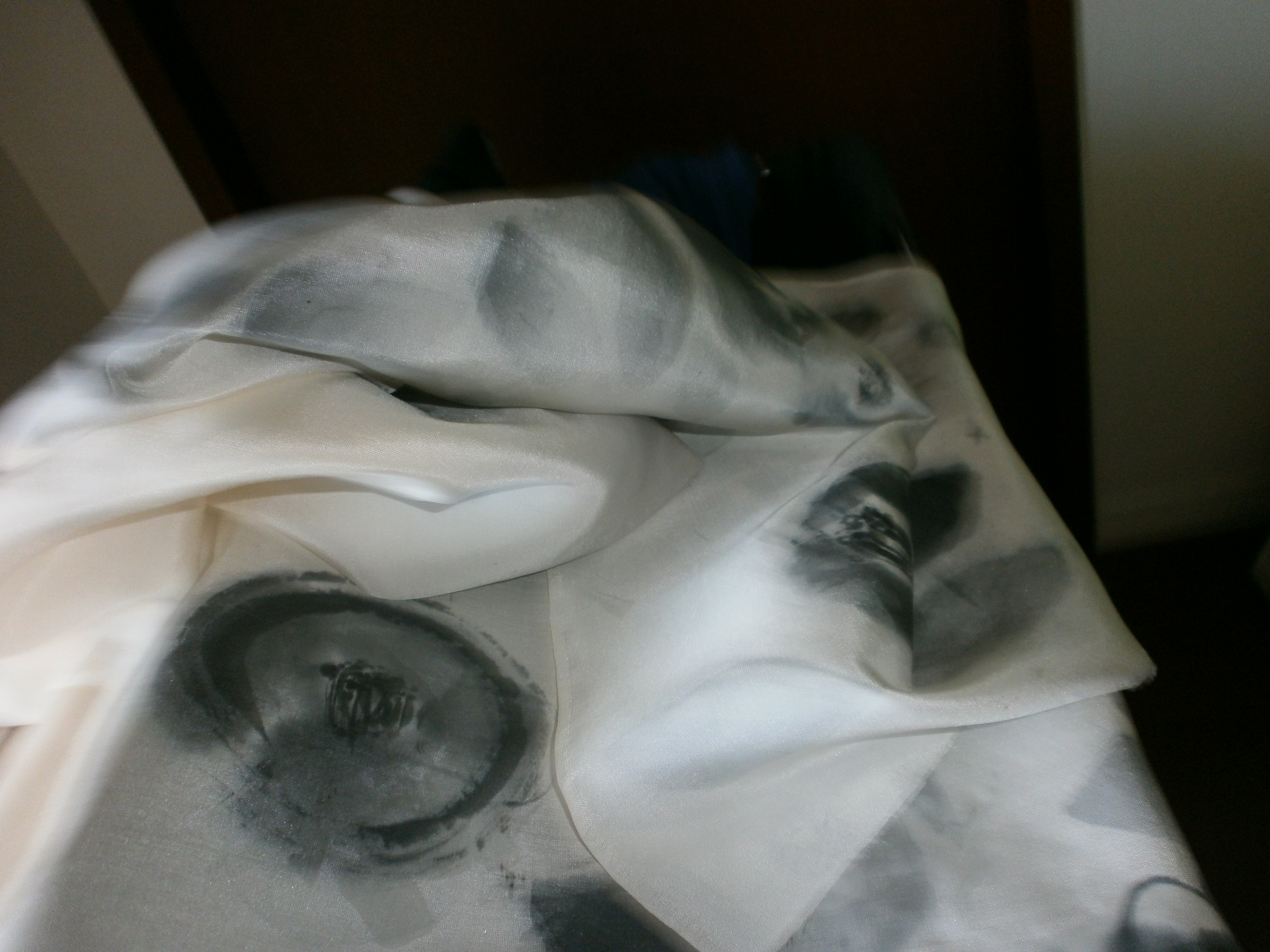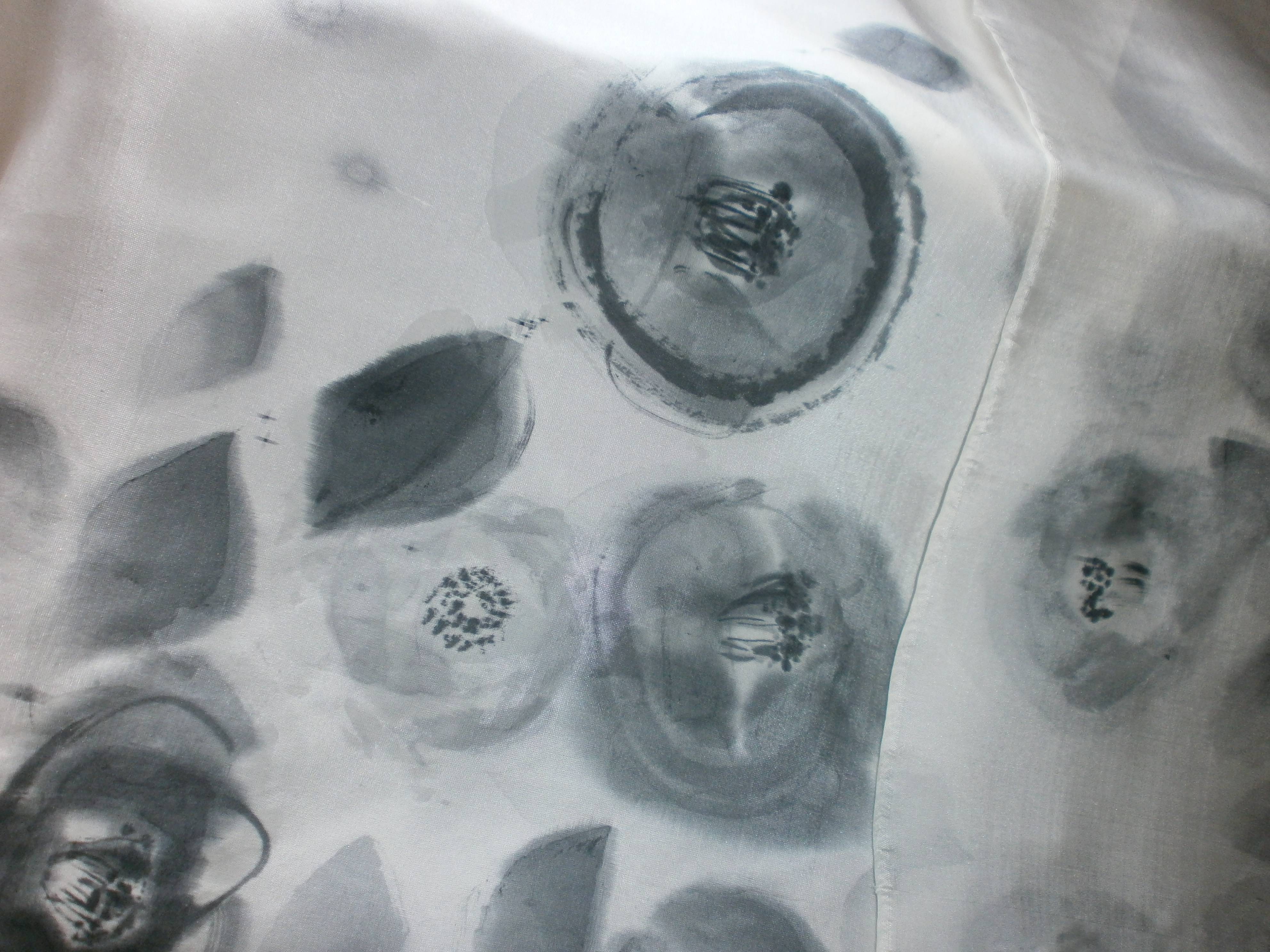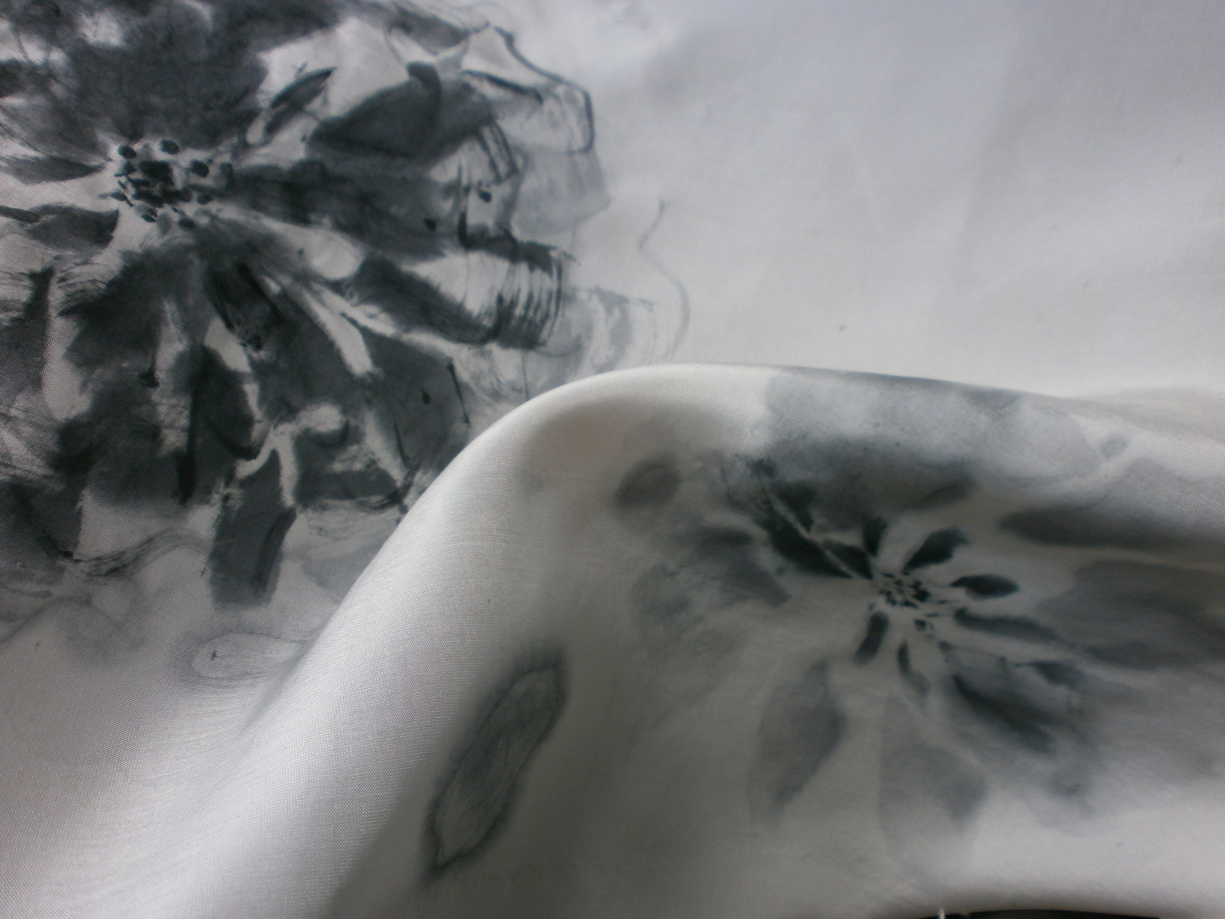 今とりかかっているのは 古い着物の生地を生かしステージ衣装やドレスを作られているデザイナーさんよりお声掛け頂き、生地に墨画を描いています。