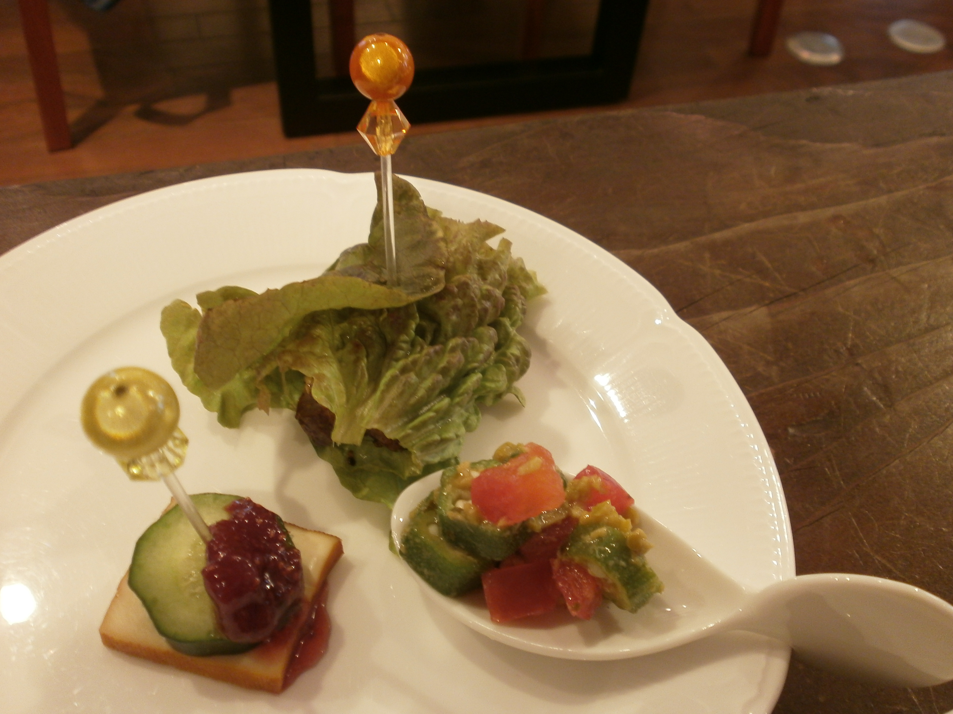 オードブルに手作りベーコンのレタス巻き・お豆腐の燻製・おくらトマトとアンチョビのオリーブ和え
