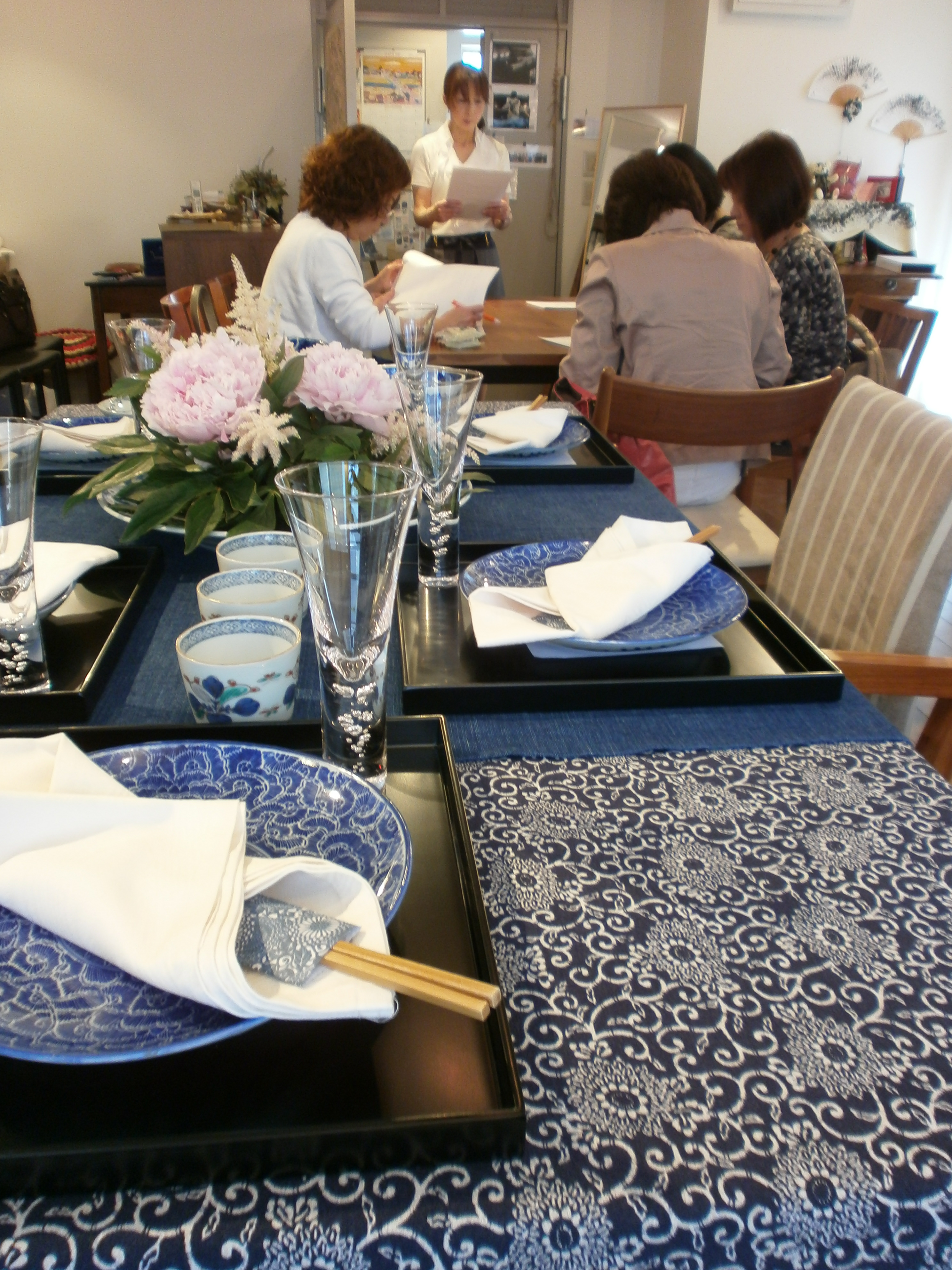藍色を基調にしたクロスに 古器でしつらえた昼の食卓。