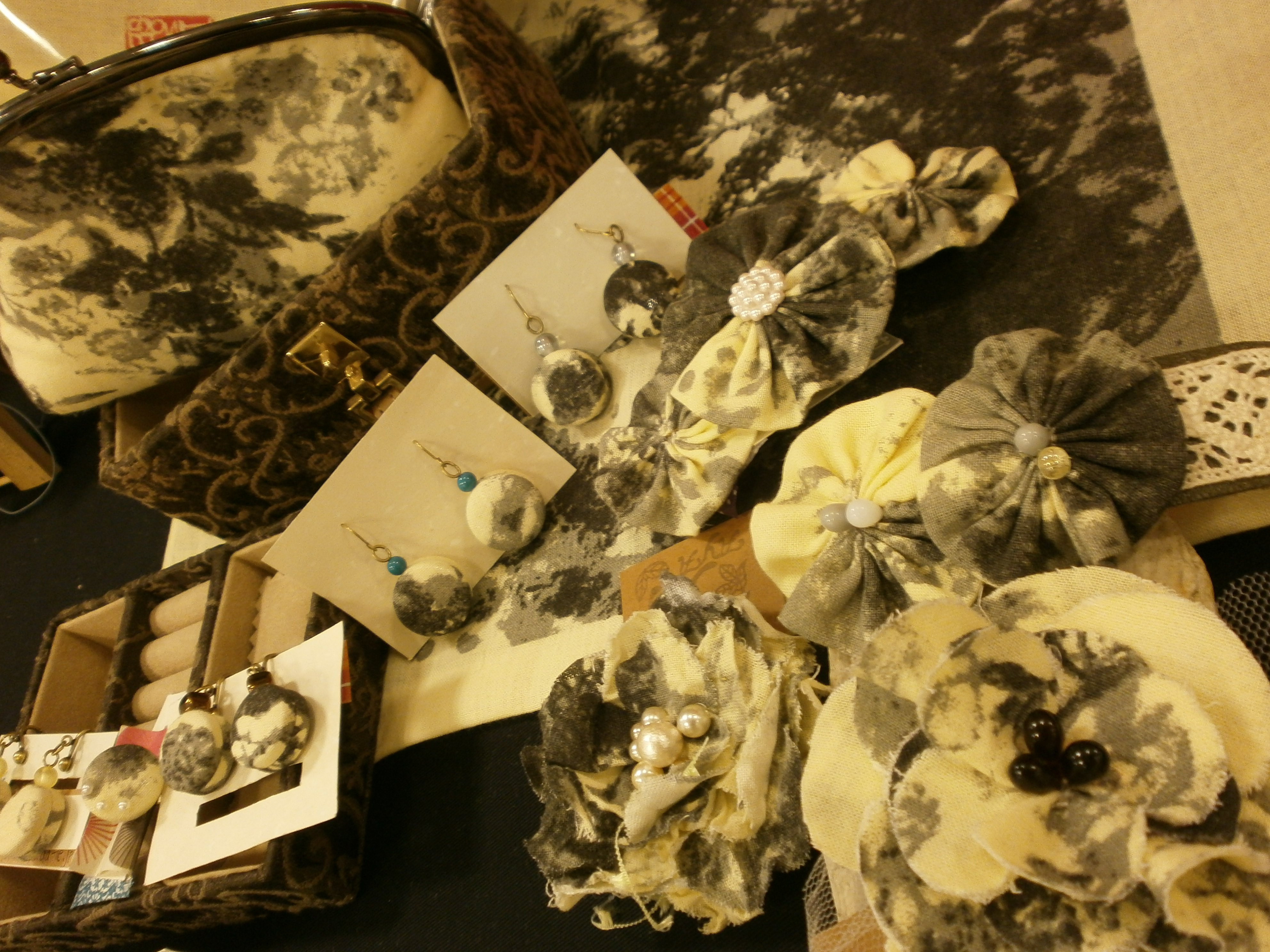 そのほか 手ぬぐい(原画は掛け軸でご覧頂いています)から想像ふくらませ、各ジャンルの作家が手掛けてくれたコサージュやイヤリング&ピアス、バレッタ、指輪、がま口・・・などなど皆さんにご覧頂きたい みんなのアイディアワールドが満載です。