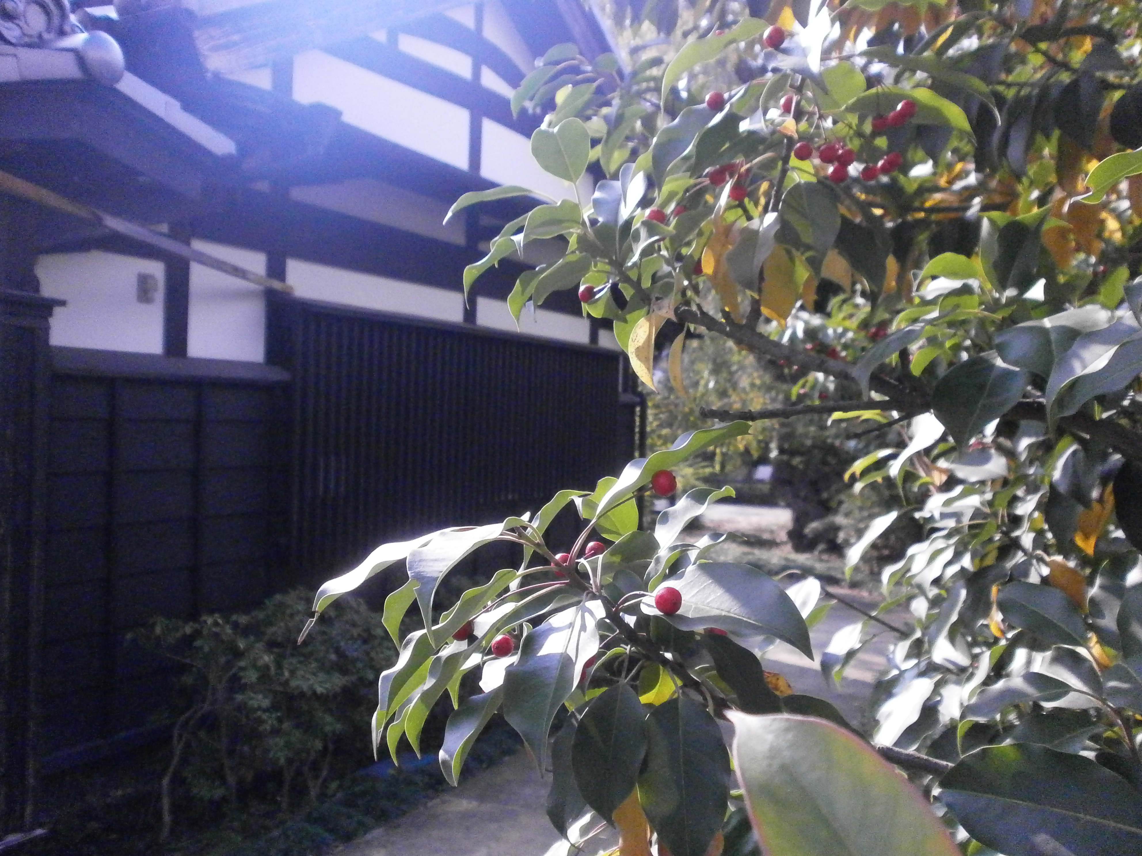 窓越しに眺める 庭園の緑や 古木の柱など