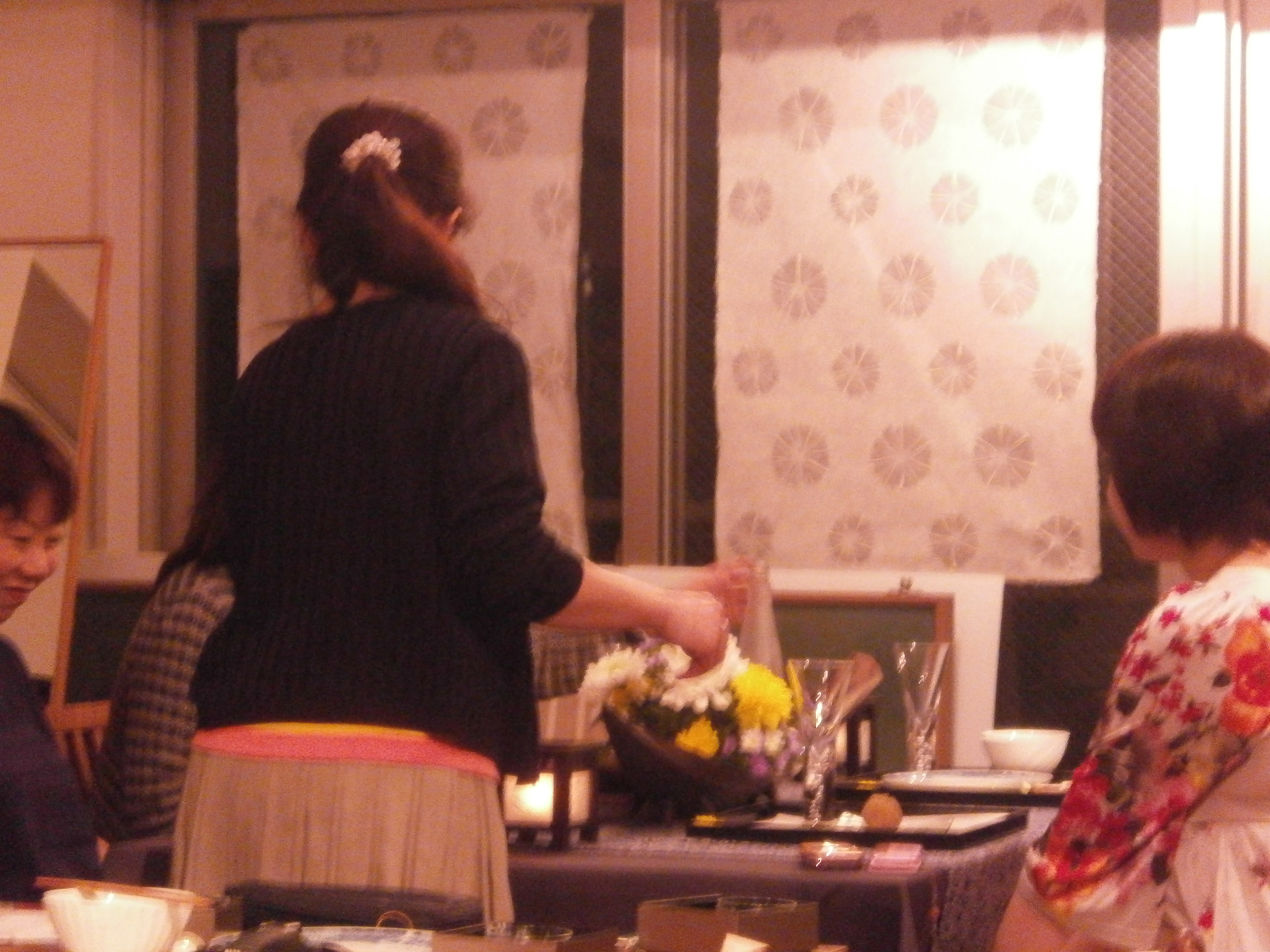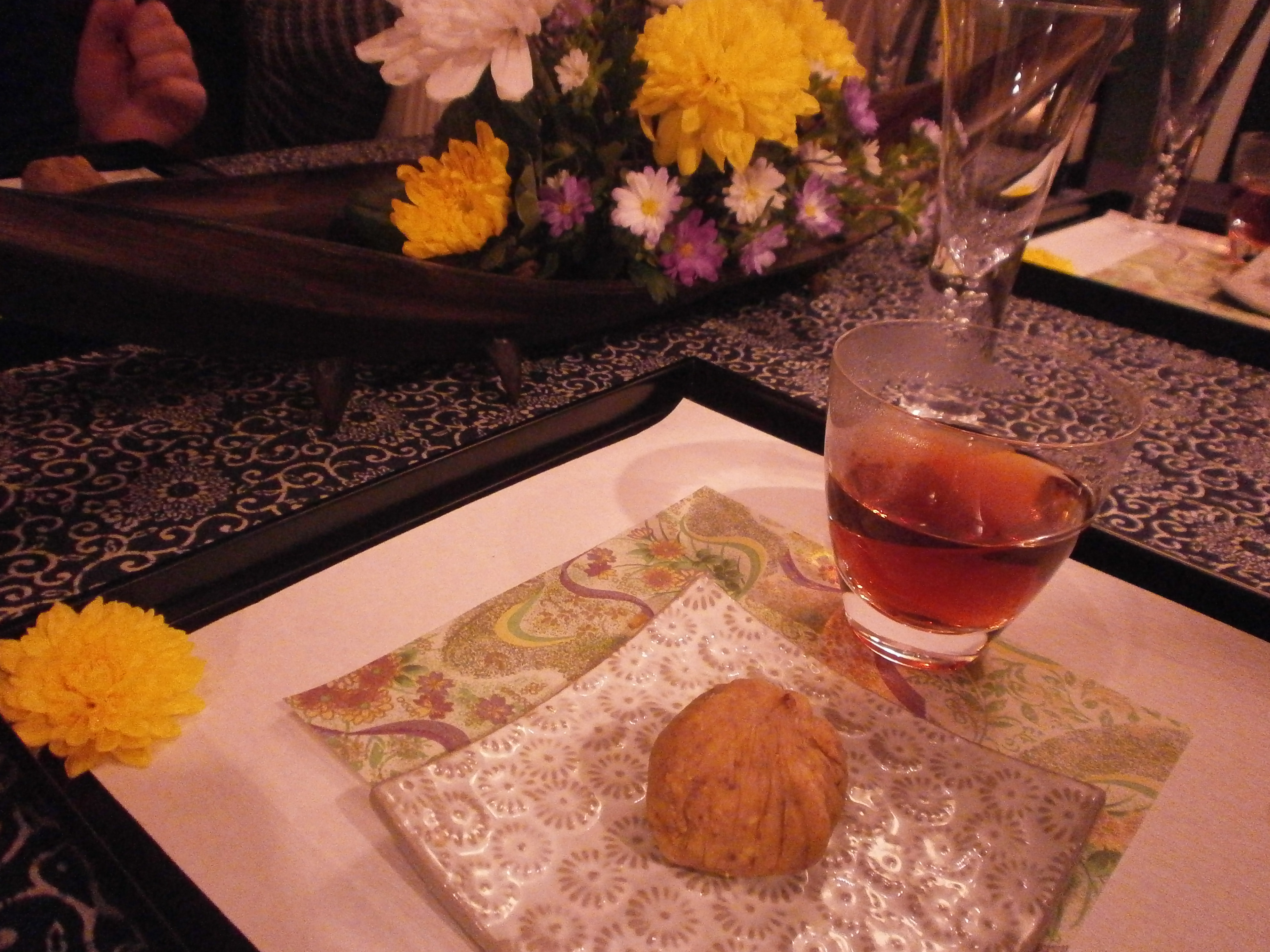 お花とお酒を楽しみながら 柿の塩ヨーグルトあえ、梨のパンチェッタ巻き、菊のちらしずし、鳥ささみのみのあげ、里芋としゃけの味噌グラタン・・・などなど