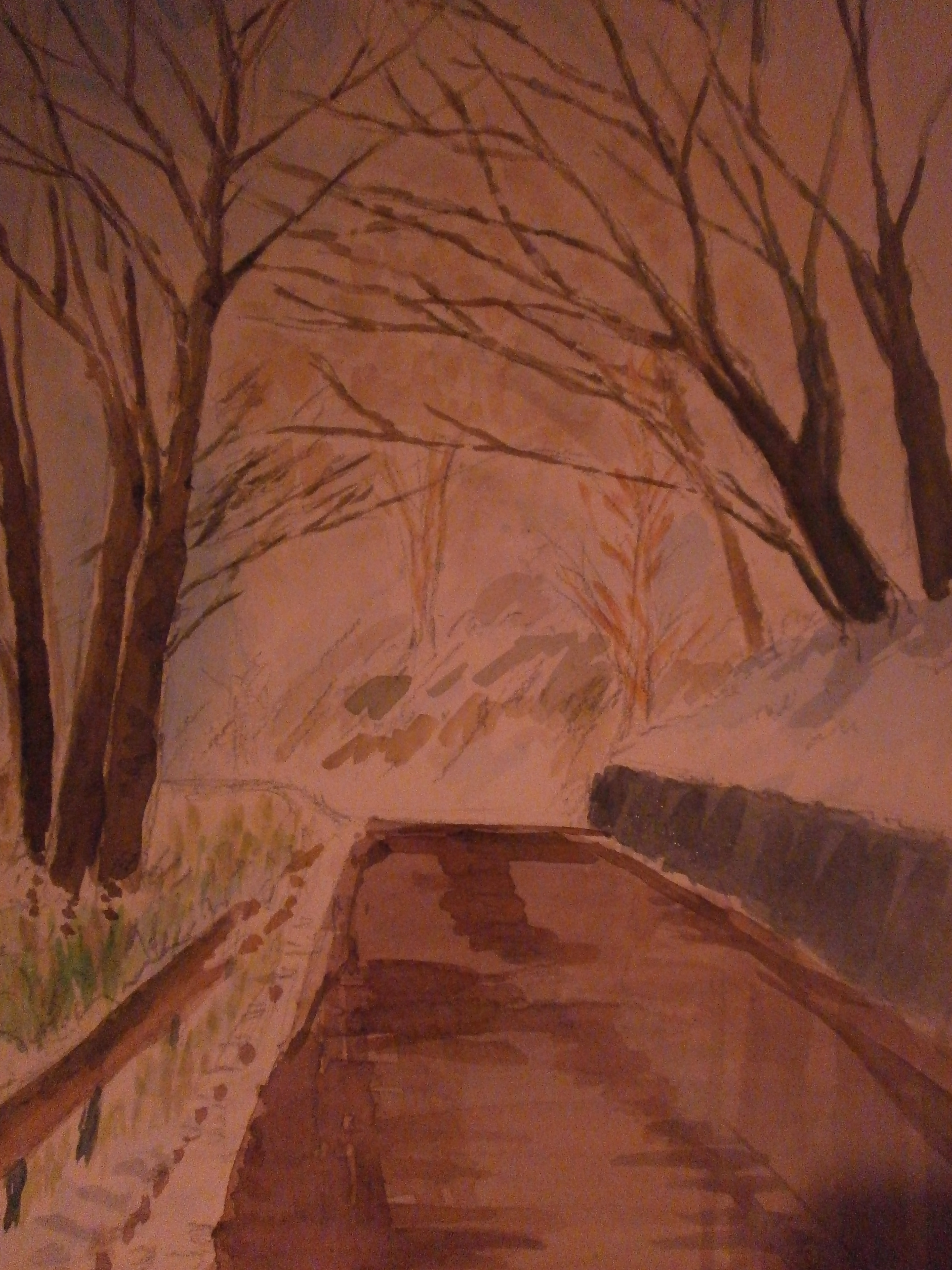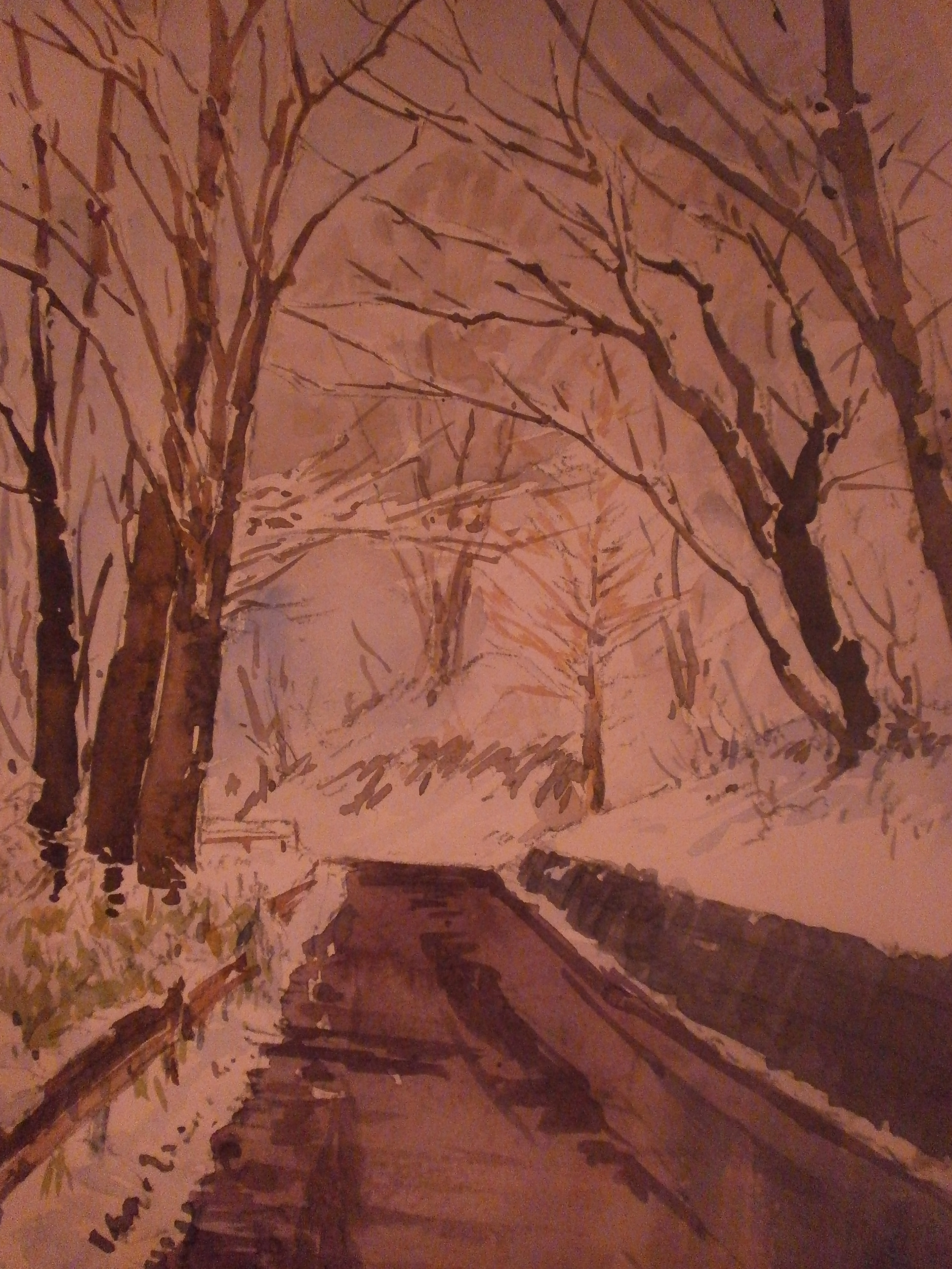 今日は青葉区向田方面へむかう車道、木々から寒さが伝わる冬の風景を描きました。