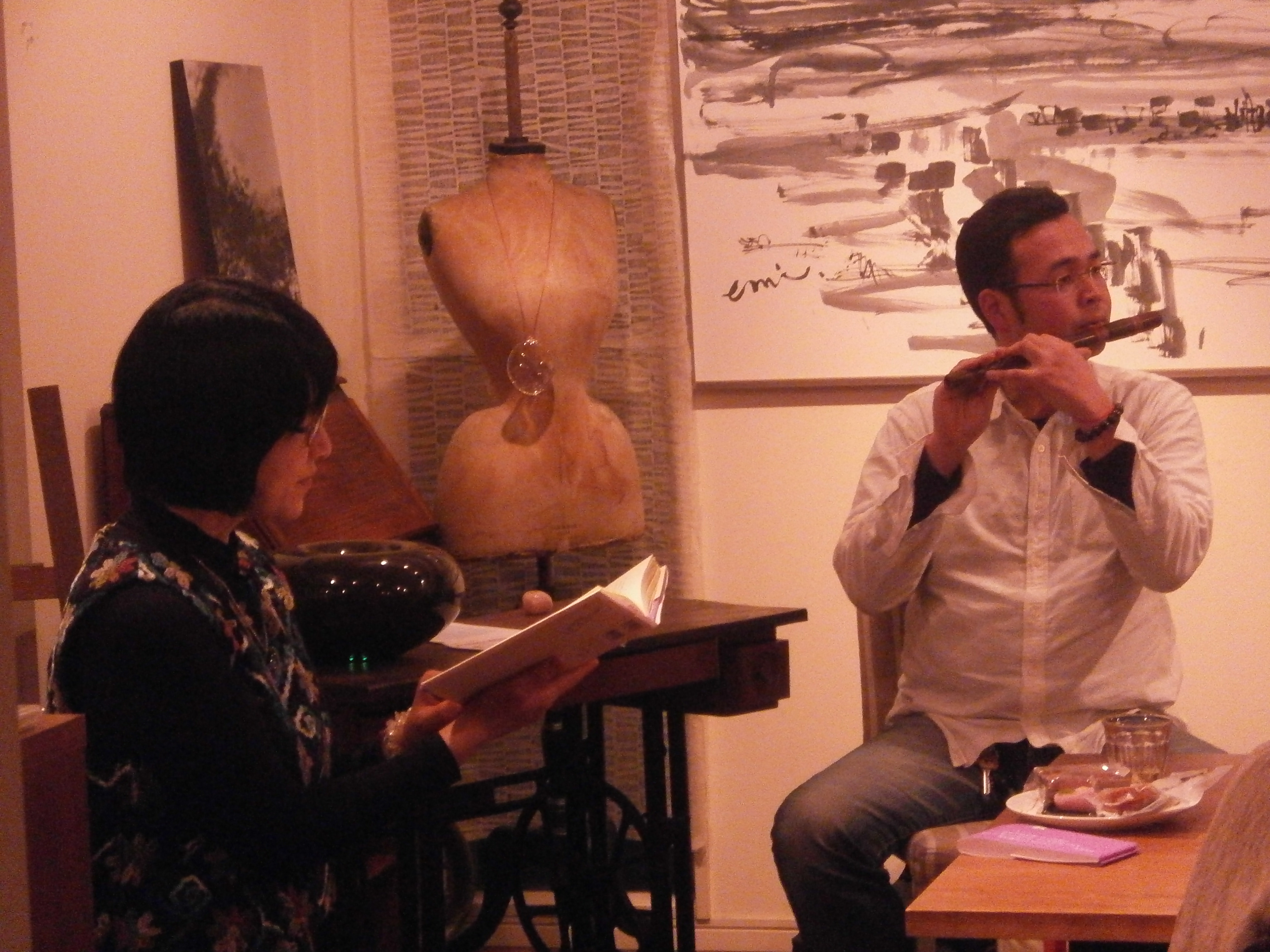 雅楽の本を荒井さんが朗読。神社で耳にすることの多い龍笛の音色は
