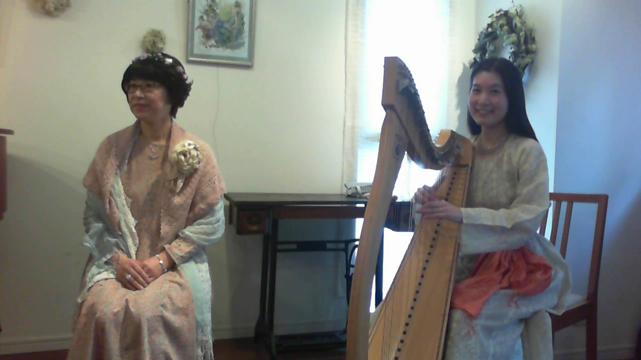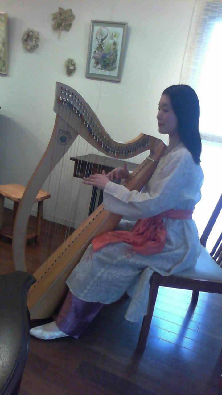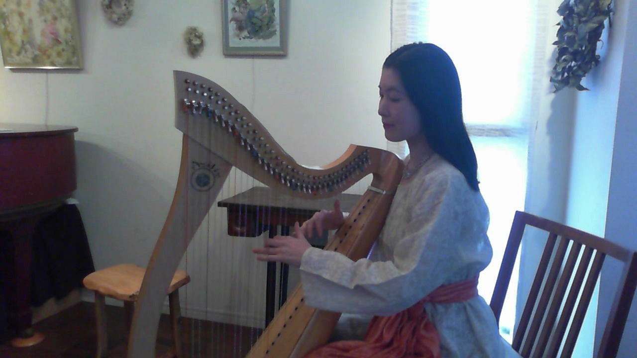 ハープの他 しずくの形をしたライアーという楽器も演奏。