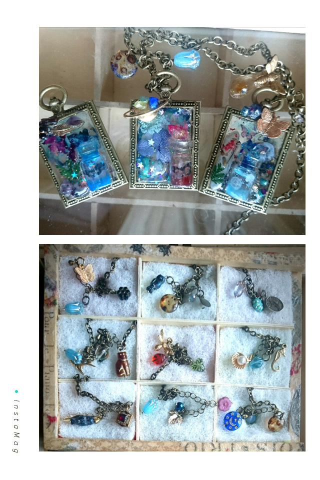 様々な背景の土台を選び、お好きなモチーフを樹脂で閉じ込めて物語性のあるペンダントを作ります。