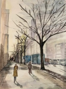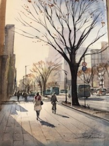 柴田治先生の土曜教室、新年のはじまりは仙台市中心街、東二番丁通りを描きました。
