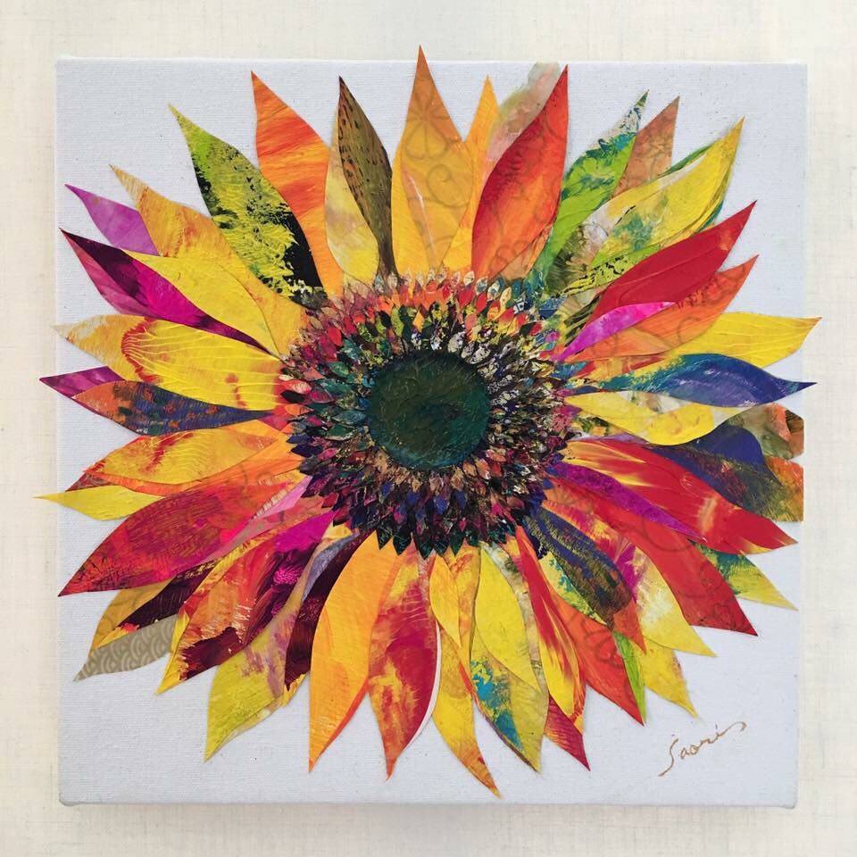 色とりどりの紙の花びらを自由に選んで貼り合わせて、個性的でエネルギッシュなひまわりを描きましょう