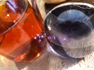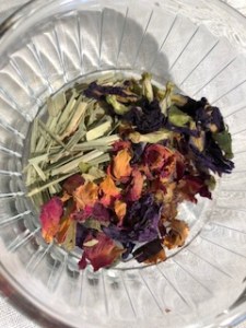目の健康や血液をきれいにするハーブ、マロウブルーやリンデンフラワー、ローズやホーリーバジルなど、効能を教えて頂き、理科の実験のように それぞれ好きなバランスで配合してみました。