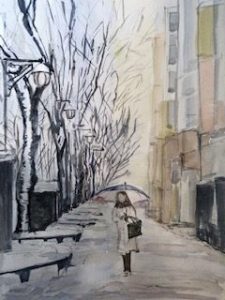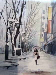 今日は仙台市街の定禅寺通り、ケヤキ並木の冬景色を描きました。