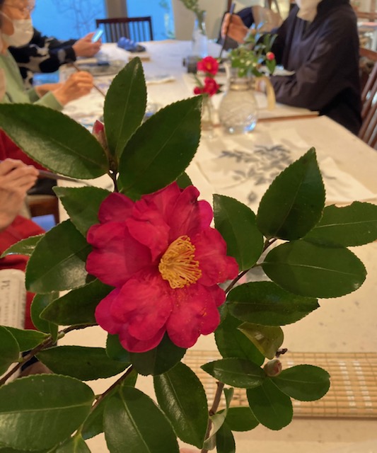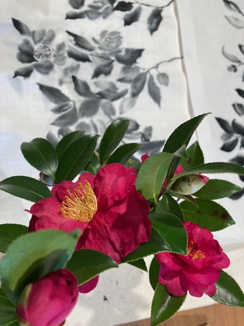 お庭の山茶花をわけて頂き、鮮やかな墨色で生き生きと表現しました。