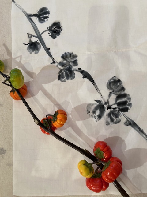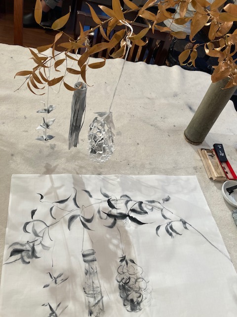 育てた茄子をお持ちいただき 自然の形の面白さを墨画にしました。