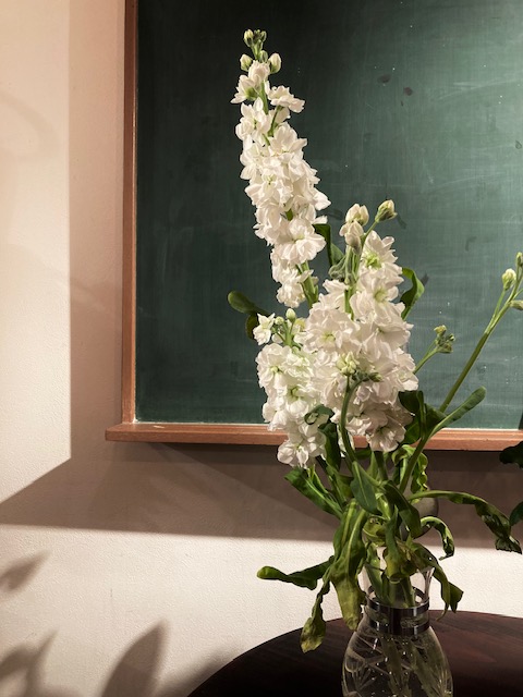 1月のはじめ 展示会のお祝いに頂いた真っ白なストック