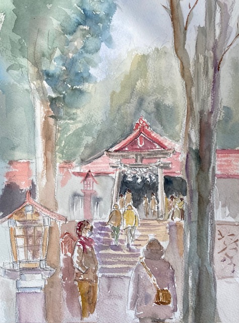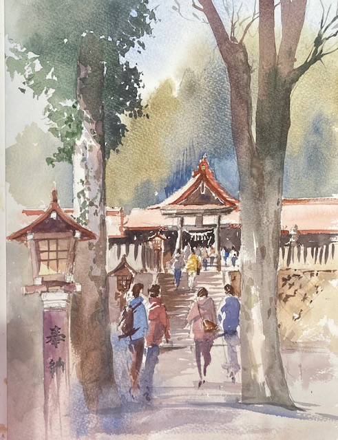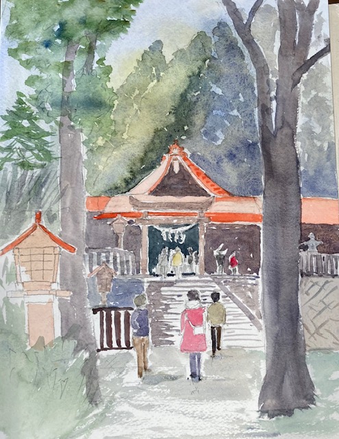 森林の緑の中、朱色の屋根が鮮やかで 水彩画にはえる色彩、