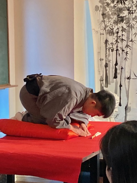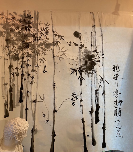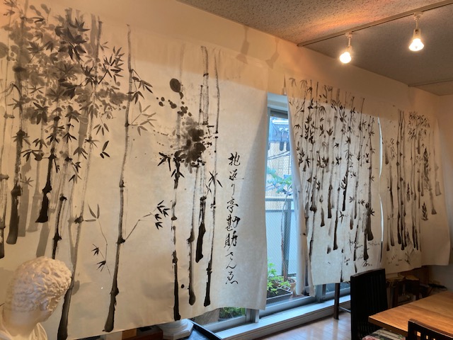 演目にあわせ墨画教室の皆さんで合作した「竹林」を飾り