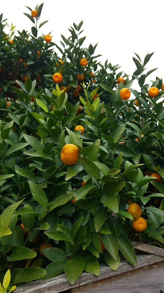 先日の積雪の中 橙色に色づいてきた実と 深い緑の葉で