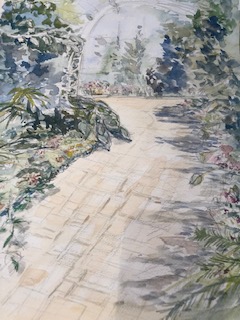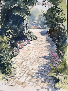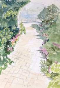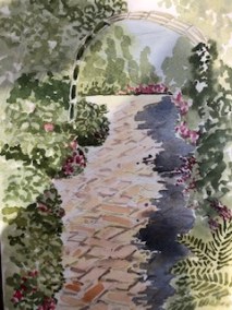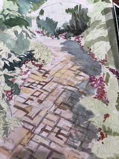 敷石と植え込みのアプローチを描きました。