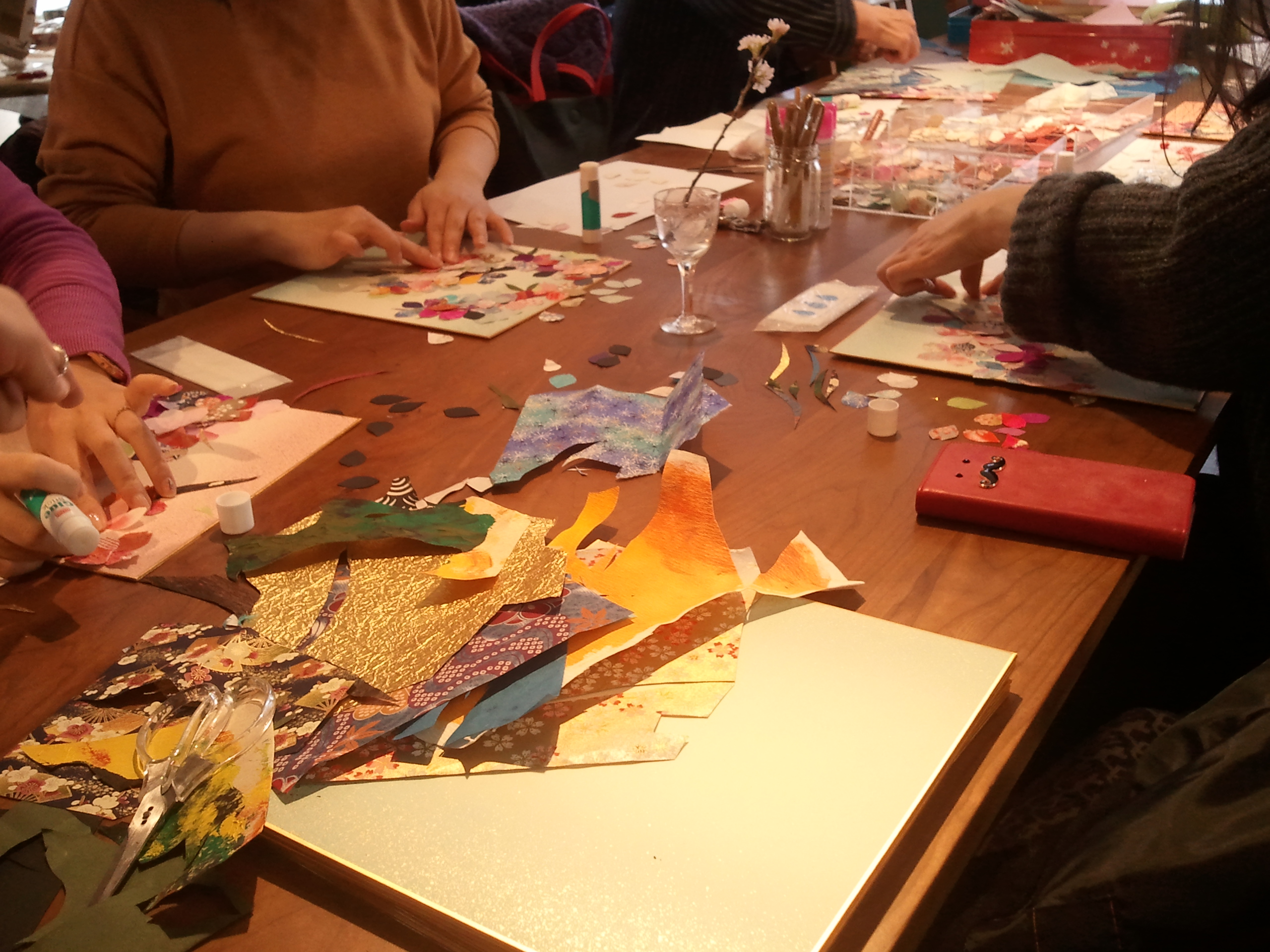 村尾沙織さんのコラージュ教室では「さくら」を貼り絵で表現。