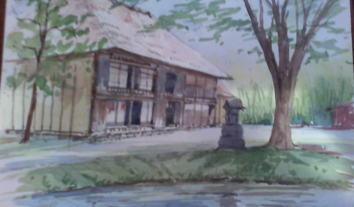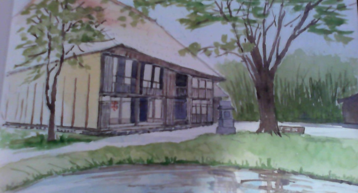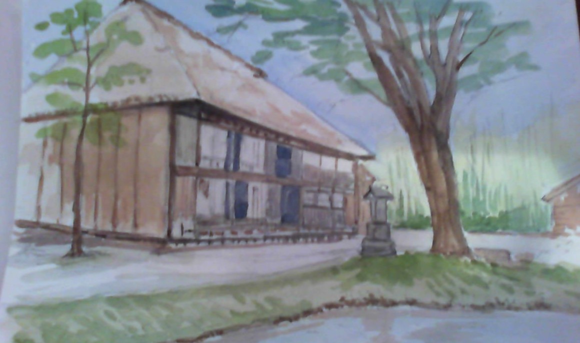 藁葺の古民家 新緑の木々を描きました。